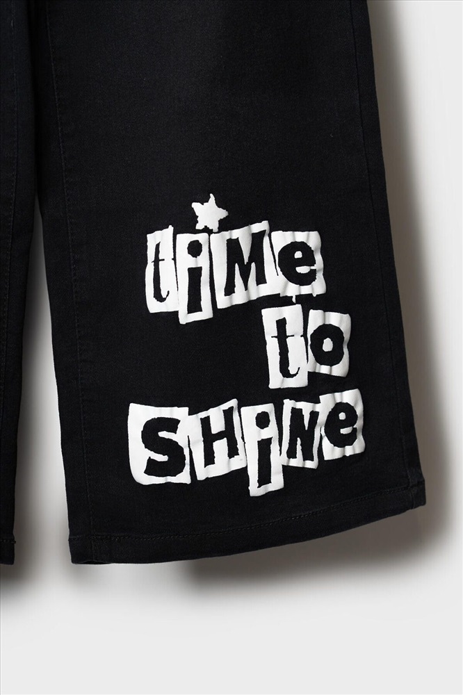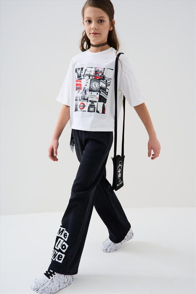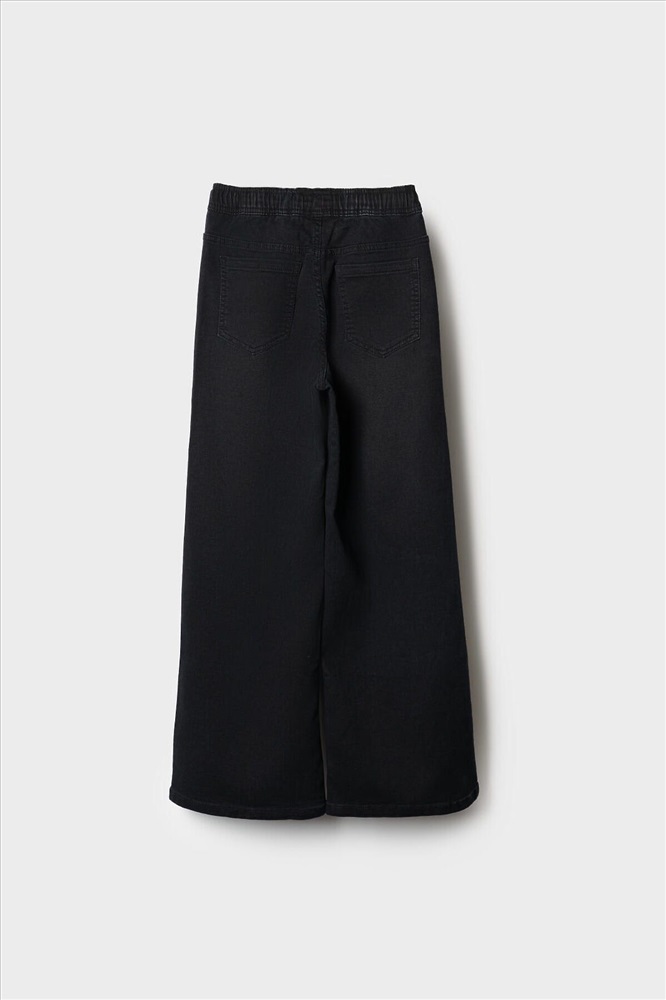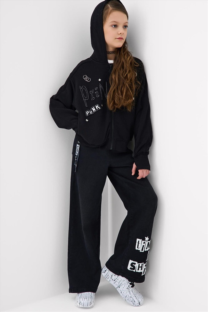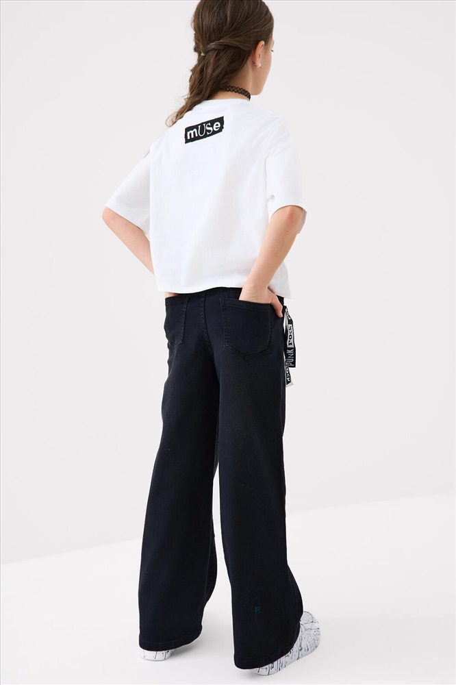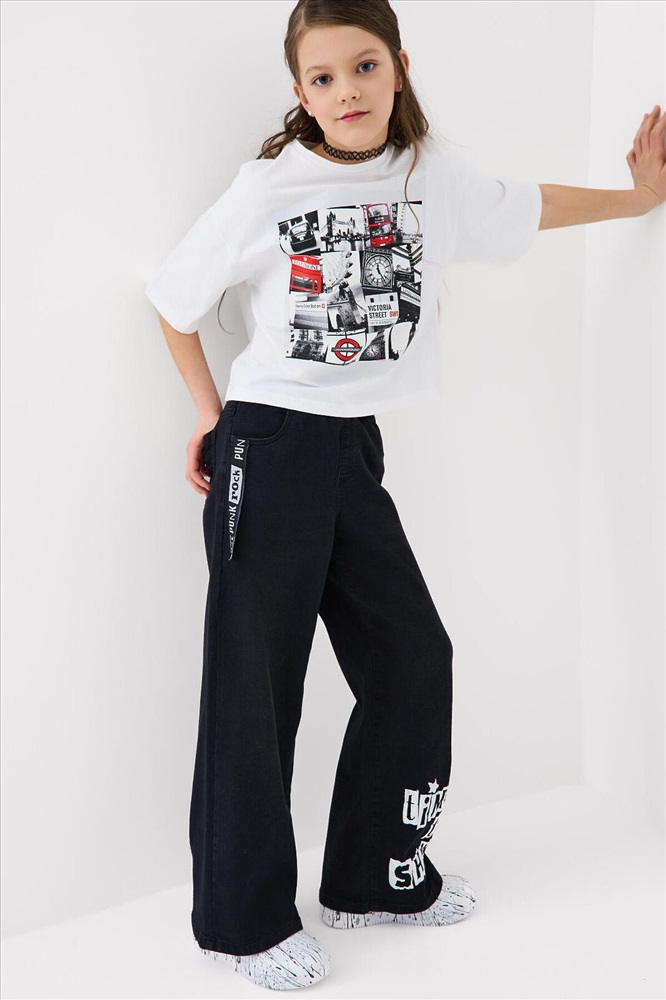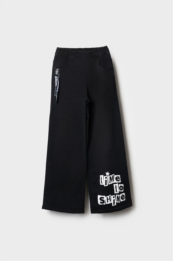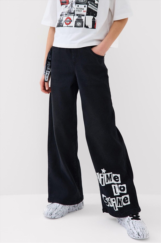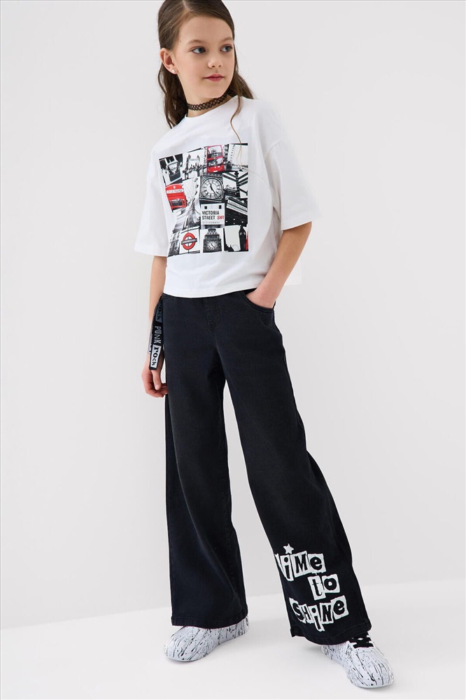 ID товара: 1240611 Состав: 70% хлопок, 28% полиэстер, 2% эластан Сезон: Весна/Лето Стильные широкие джинсы для девочки подростка. Пояс на резинке со шнурком делает посадку комфортной и регулируемой. Модель wide leg из черного денима с модным эффектом выварки. У них прямой силуэт и длина до щиколотки. Спереди боковые карманы, а сзади — накладные карманы. На левой штанине — яркий принт, а с боку пояса — декоративные ленты. Комментарии к товару