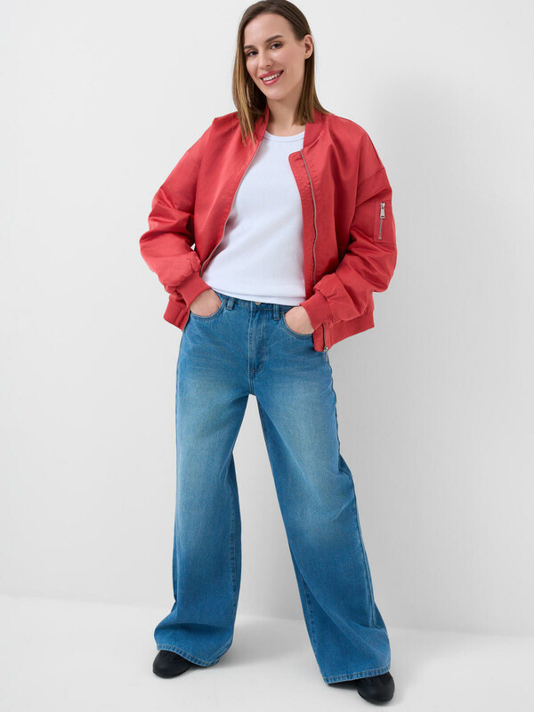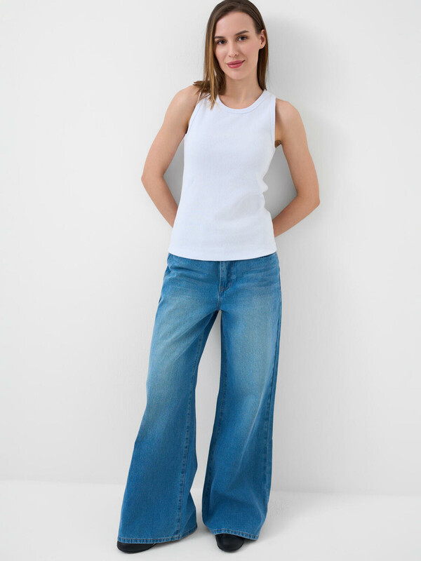 Женские широкие багги джинсы. Выполнены из светло-синего денима и имеют классический прямой крой с высокой посадкой. Спереди — два кармана, сзади — два накладных кармана. На поясе предусмотрены шлевки для ремня, а также регулируемая резинка с пуговицами внутри. Застежка — молния и болт.