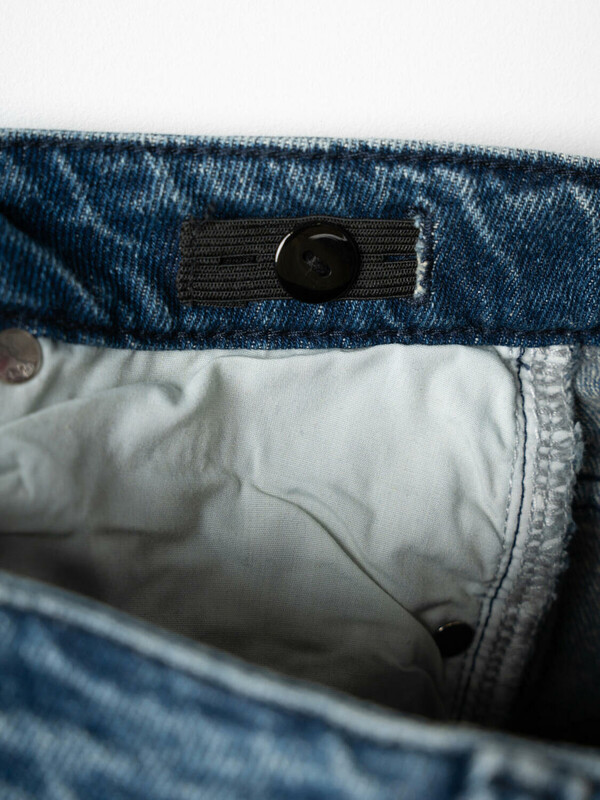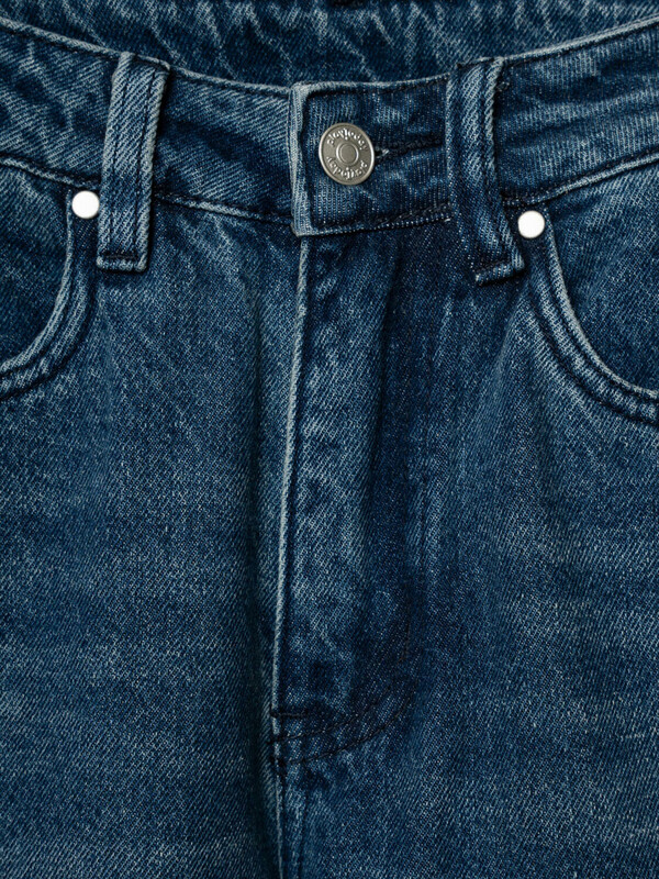 Джинсы выполнены из синего денима средней плотности. Модель отлично держит тепло, остаётся комфортной и приятной к телу даже в прохладную погоду. Прочный материал устойчив к износу и долго сохраняет опрятный внешний вид.