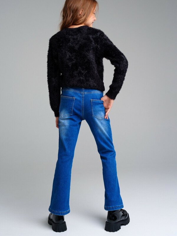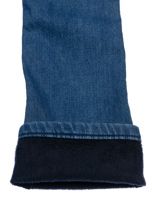 Джинсы, утепленные флисом. Модель свободного кроя с широкими штанинами. Эластичный пояс со шнурком.