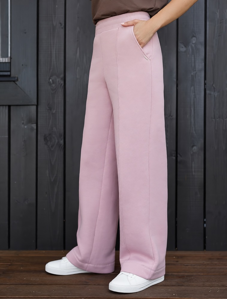 Эти уютные брюки пыльно-розового цвета созданы для вашего комфорта. Свободный прямой крой обеспечивает свободу движений и максимальное удобство в любых ситуациях, поэтому они подойдут и на большие размеры, а так же на высокий или низкий рост. Фигура подчеркивается, а силуэт визуально вытягивается за счет кроя палаццо и застроченных декоративных стрелок.