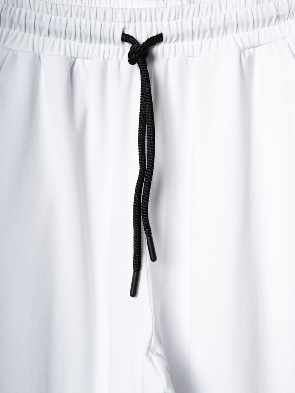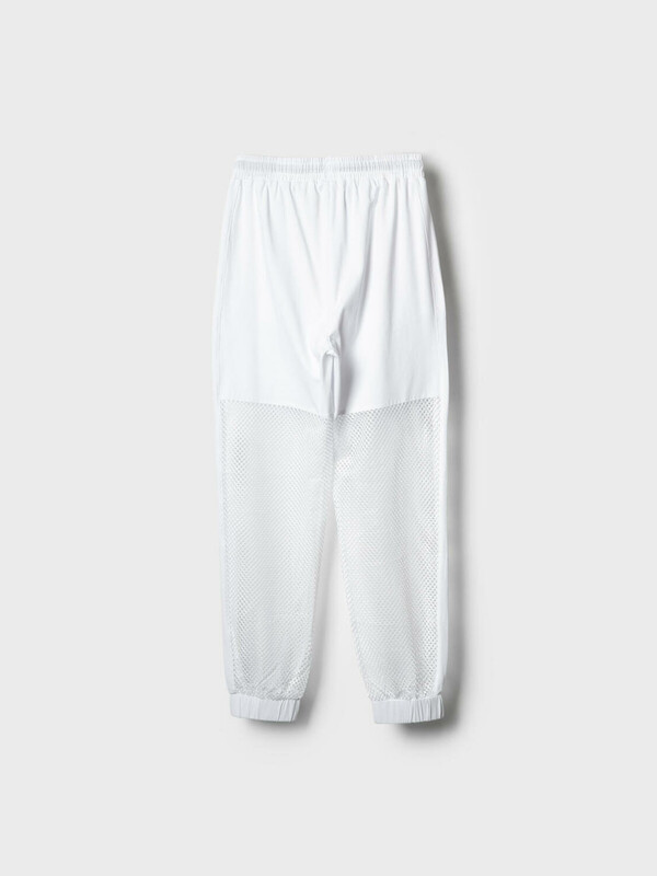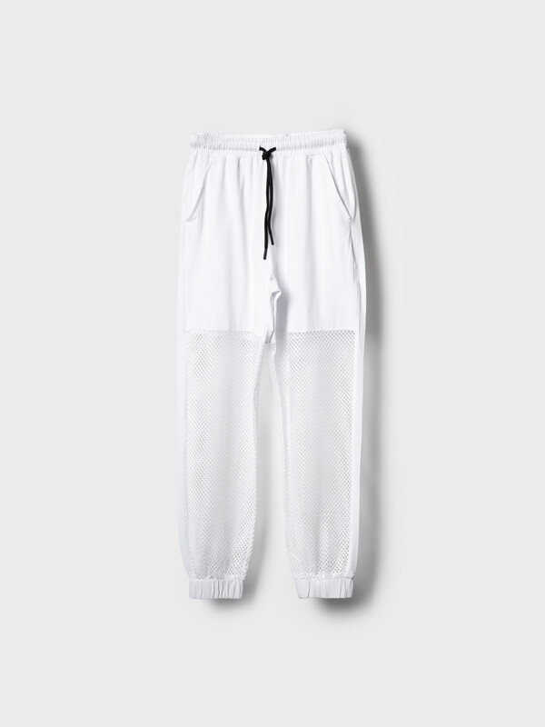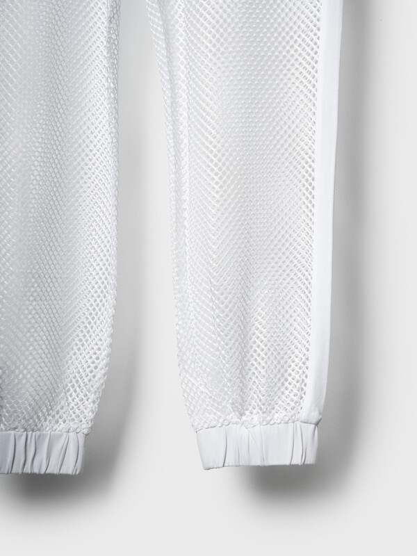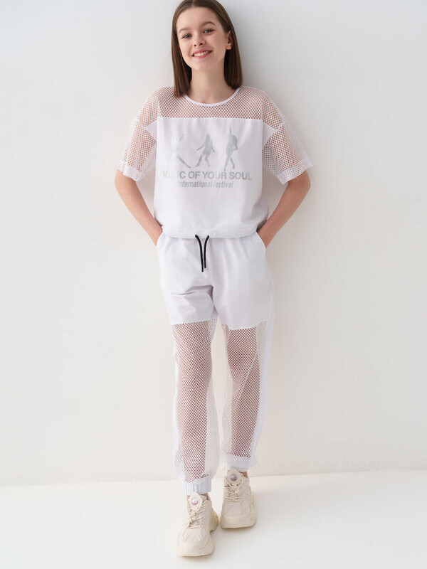 Стильные брюки для девочки подростка. Верхняя часть выполнена из плотного хлопкового трикотажа, а нижняя — из легкой прозрачной сетки, создающей модный контраст и эффект "двойного слоя". Брюки имеют эластичный пояс со шнурком и удобные боковые карманы. Низ брючин собран на резинку, благодаря чему брюки хорошо сидят по фигуре. По бокам и передней части расположены лампасы, добавляющие спортивный акцент.