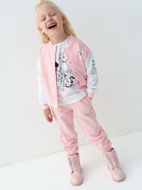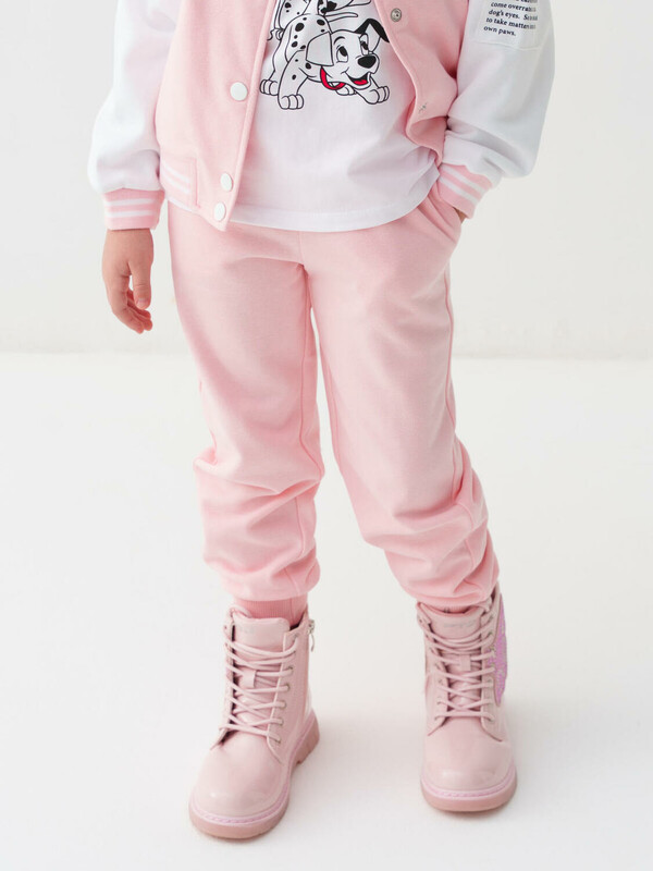 Детские спортивные брюки для девочки. Выполнены из хлопкового трикотажа футер без начеса. Модель свободного кроя со средней посадкой на талии. Пояс выполнен на резинке, дополнительно регулируется шнурком. По бокам — удобные карманы. В нижней части брючин предусмотрены эластичные трикотажные манжеты для лучшей посадки.