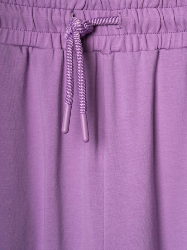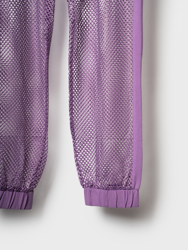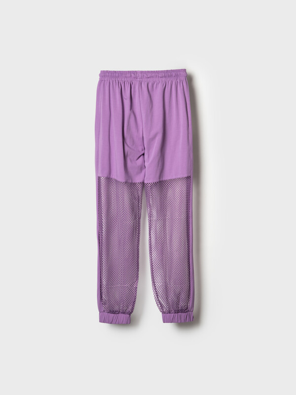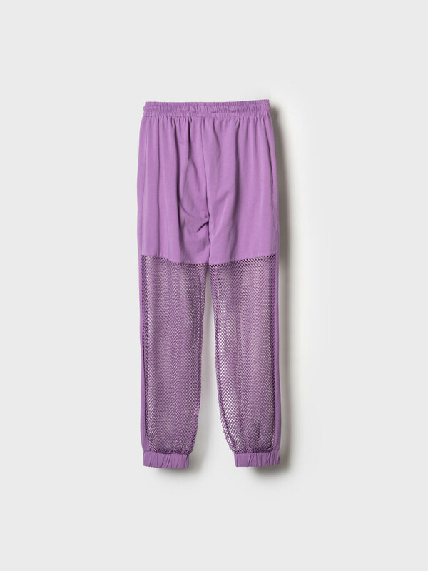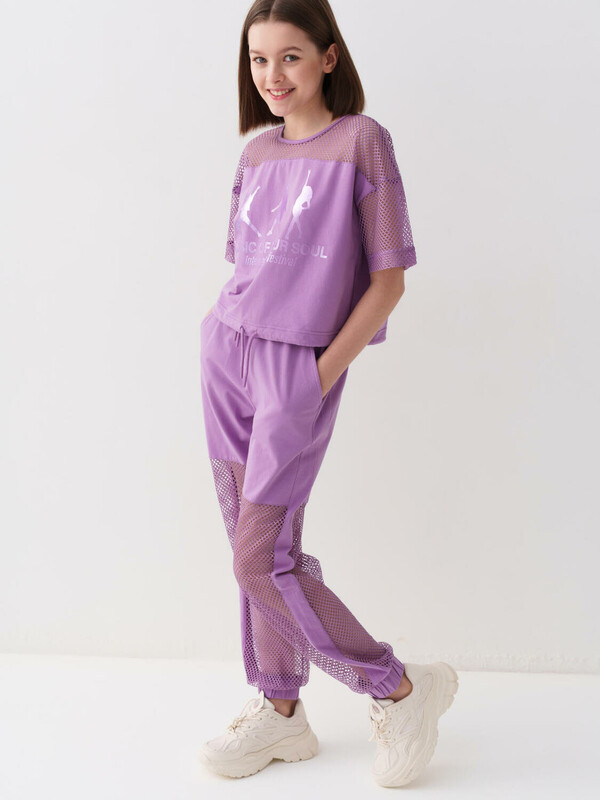 Стильные брюки для девочки подростка. Верхняя часть выполнена из плотного хлопкового трикотажа, а нижняя — из легкой прозрачной сетки, создающей модный контраст и эффект "двойного слоя". Брюки имеют эластичный пояс со шнурком и удобные боковые карманы. Низ брючин собран на резинку, благодаря чему брюки хорошо сидят по фигуре. По бокам и передней части расположены лампасы, добавляющие спортивный акцент.