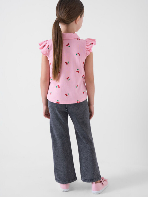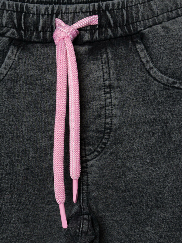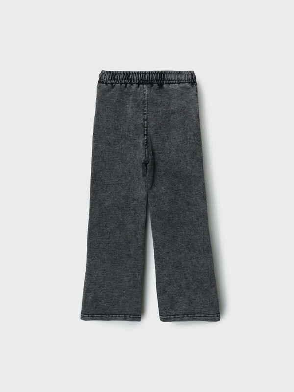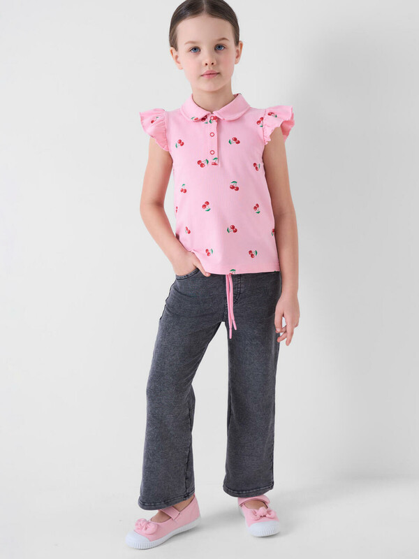 Детские брюки для девочки. Модель клеш, выполнена из мягкого хлопкового трикотажа с эффектом денима. У брюк высокий комфортный пояс на резинке и шнурок для регулировки. Спереди — два удобных кармана.