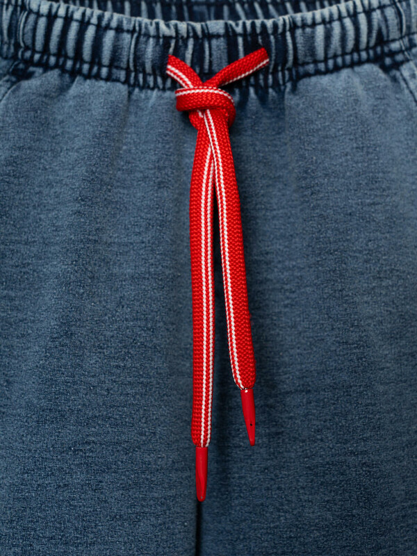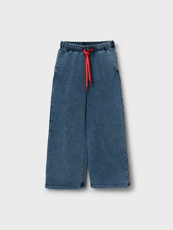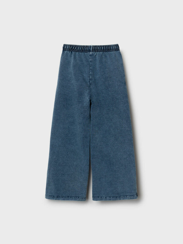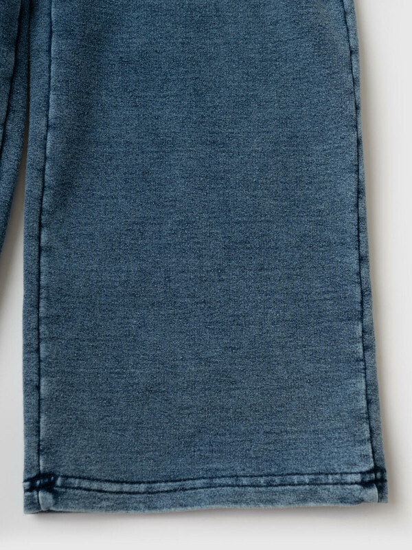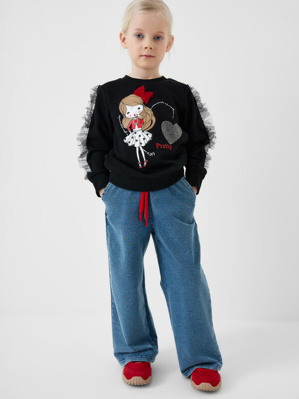 Детские брюки для девочки. Модель прямого кроя, выполнена из мягкого хлопкового трикотажа с эффектом денима. У брюк комфортный пояс на резинке и шнурок для регулировки. Спереди — два удобных кармана.