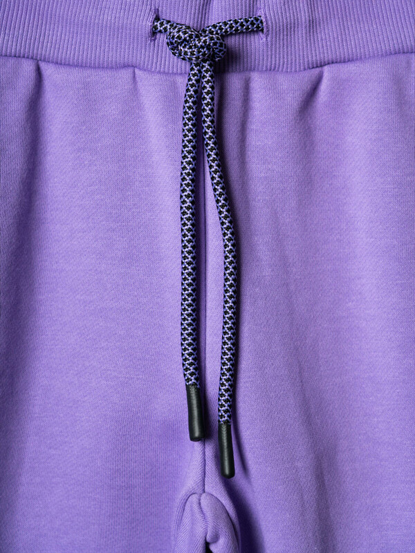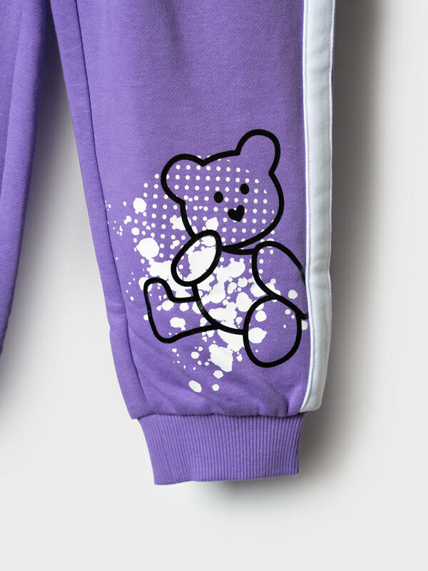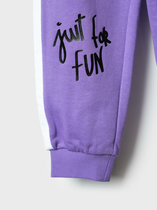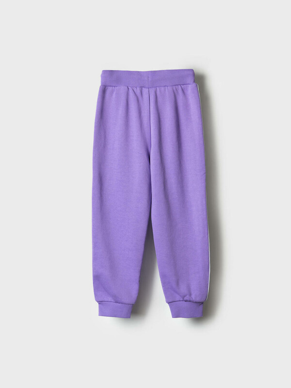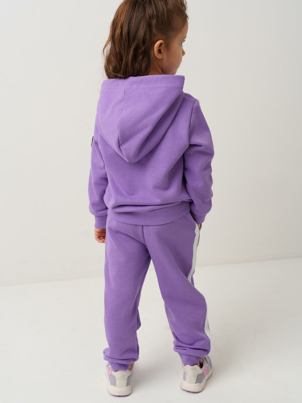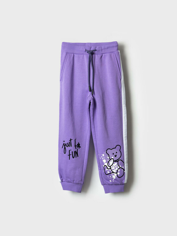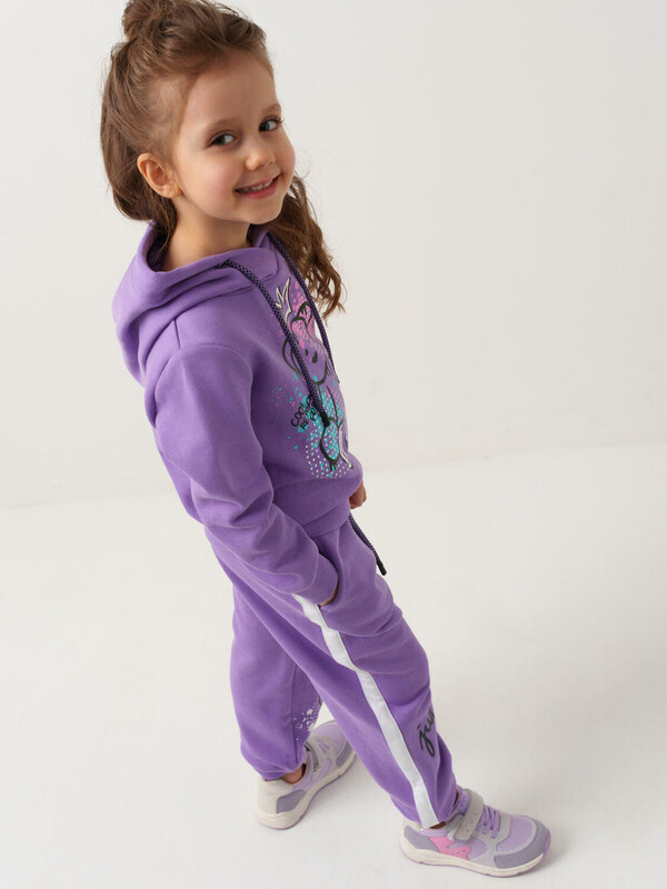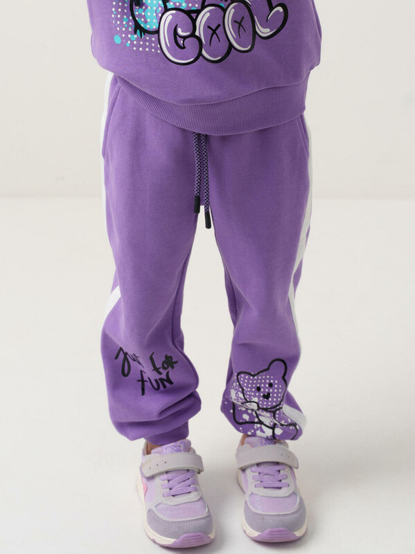 Брюки детские для девочки. Выполнены из хлопкового трикотажа футер без начеса. Модель прямого кроя со средней посадкой на талии. Пояс выполнен на резинке, дополнительно регулируется шнурком. По бокам — удобные карманы. В нижней части брючин предусмотрены эластичные трикотажные манжеты для лучшей посадки. Украшены лампасами и принтами.