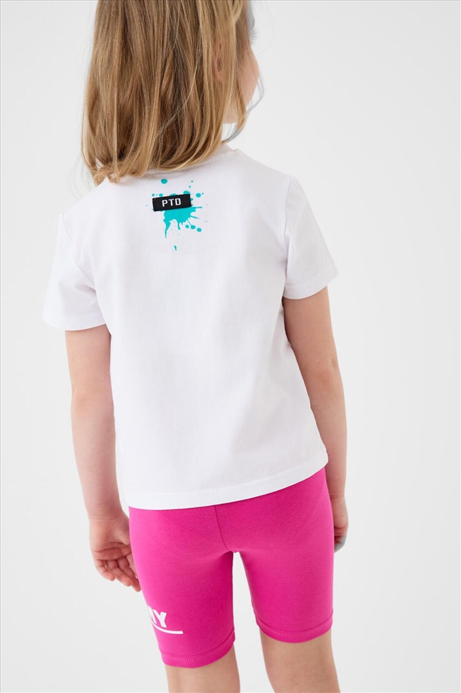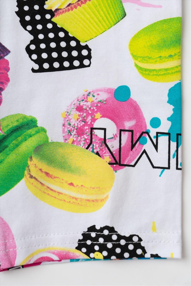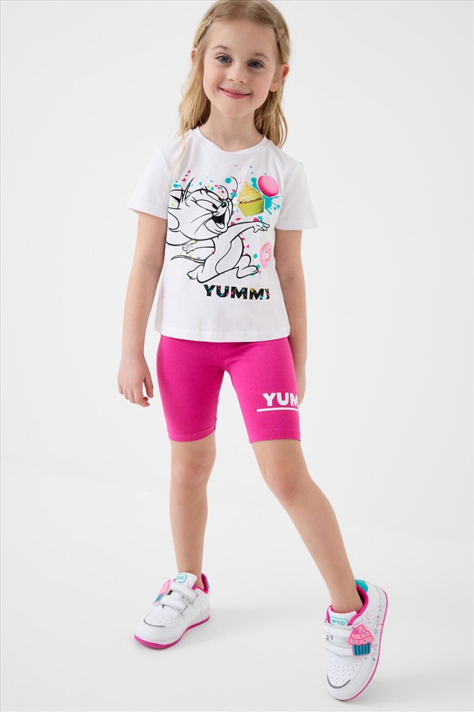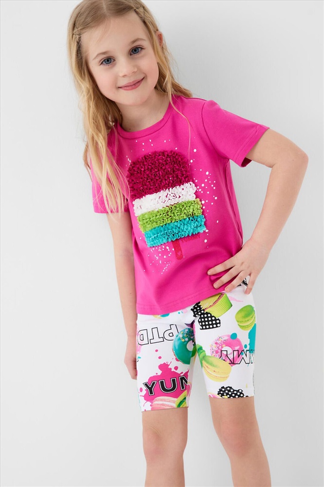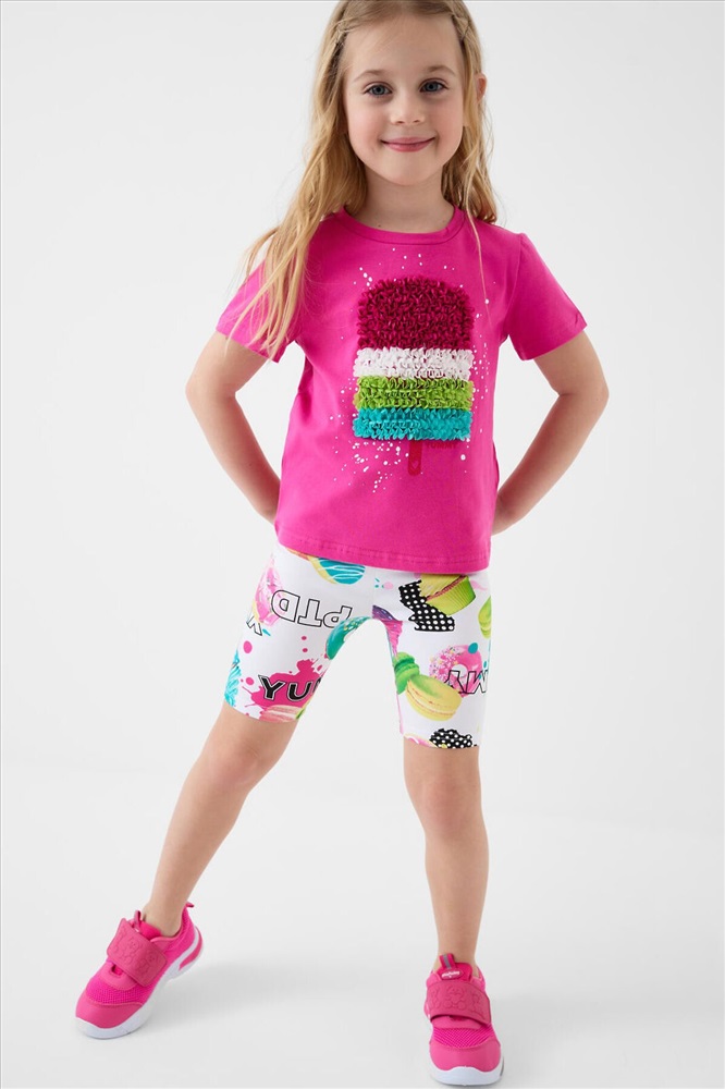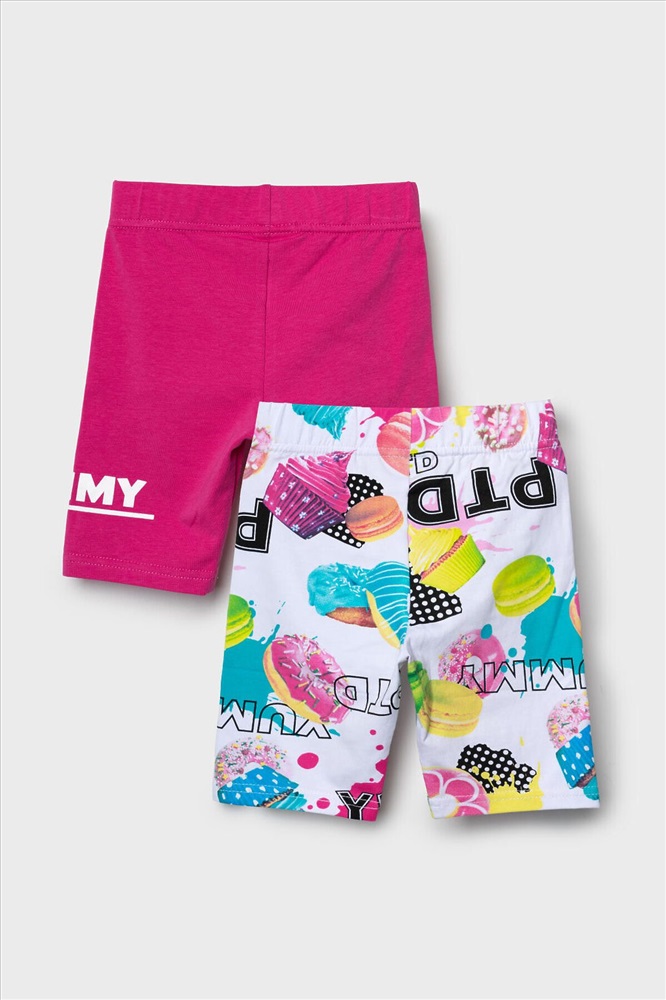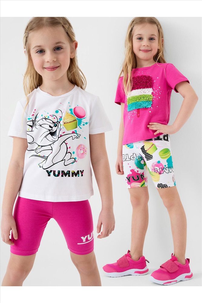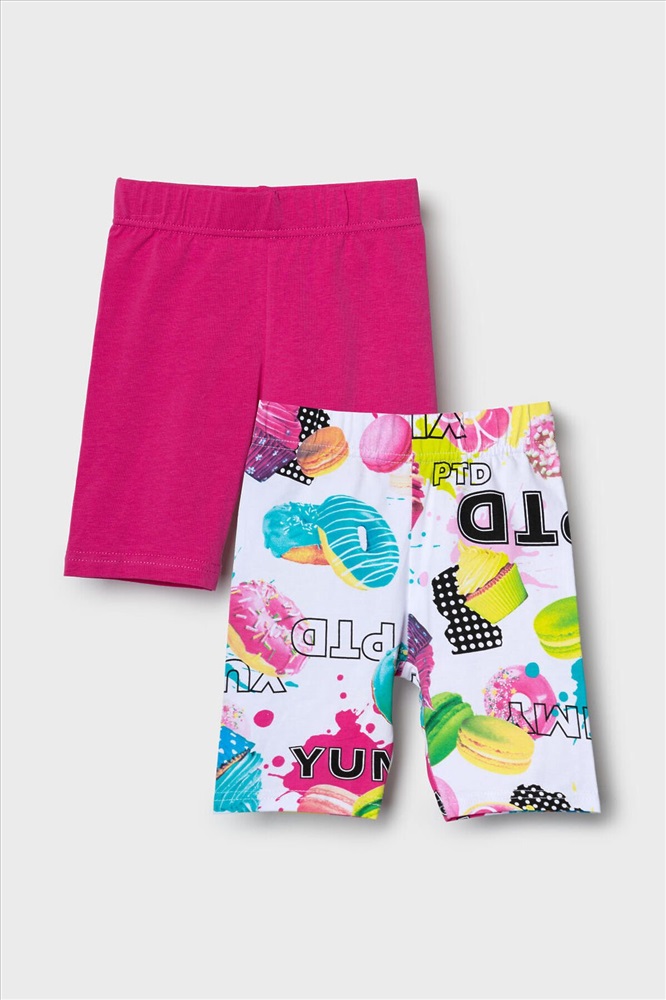 ID товара: 1240210 Состав: 95% хлопок, 5% эластан Сезон: Весна/Лето Набор детских легинсов для девочки. Комплект состоит из двух пар укороченных легинсов. Первая пара выполнена в розовом цвете, вторая — с ярким принтом пончиков, макарунов и капкейков. Обе модели имеют высокую посадку и эластичный пояс, который хорошо фиксирует изделие на талии. Материал - мягкий, хлопковый трикотаж. Комментарии к товару