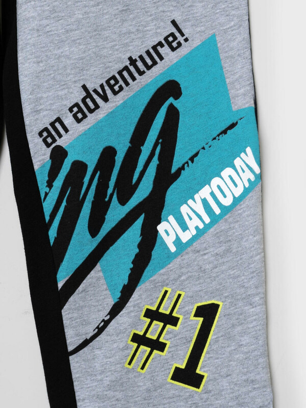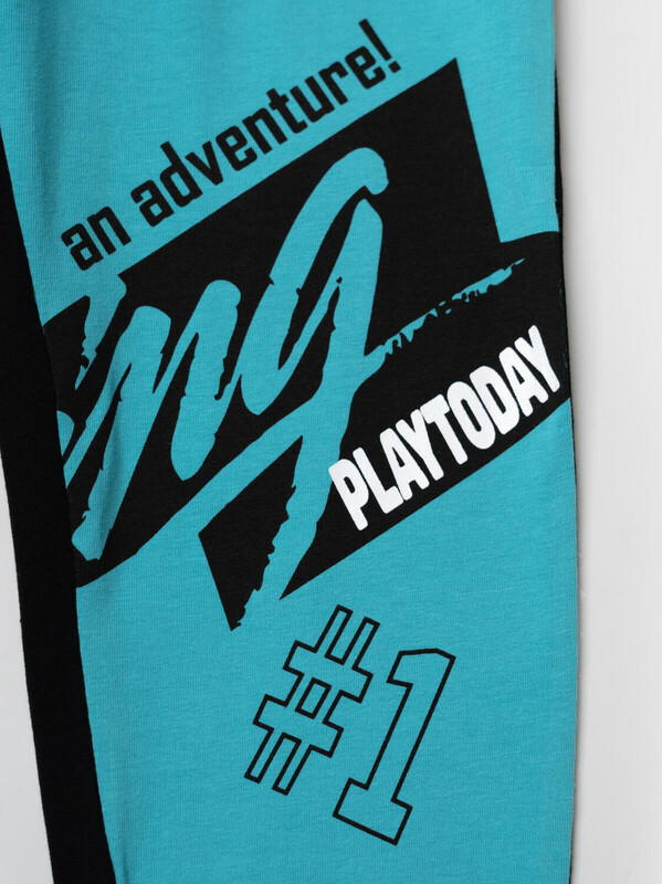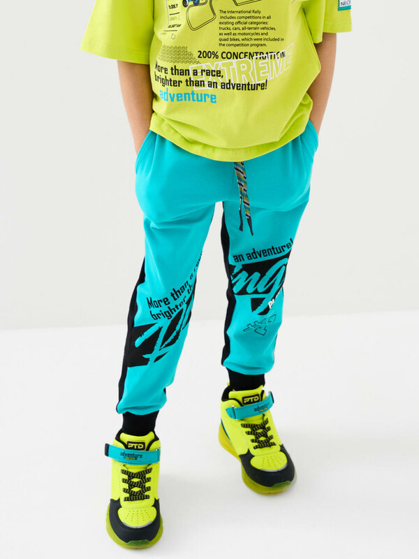 Комплект детских брюк-джоггеров для мальчика. Набор из двух джоггеров выполнен из хлопкового трикотажа джерси. Модель прямого кроя со средней посадкой на талии. Пояс выполнен на резинке, дополнительно регулируется шнурком. По бокам — удобные карманы. В нижней части брючин предусмотрены эластичные трикотажные манжеты для лучшей фиксации. Украшены принтами.