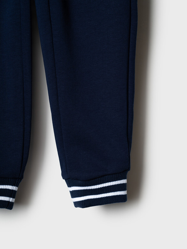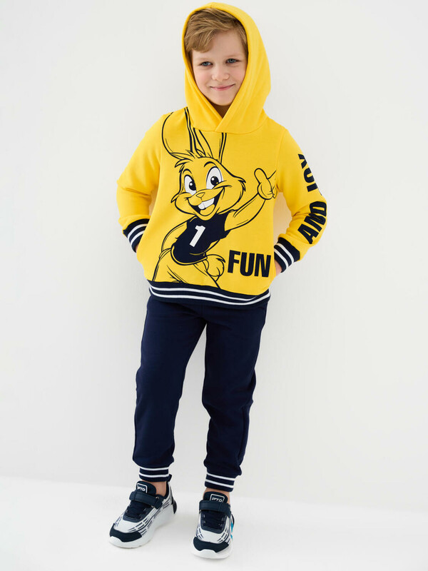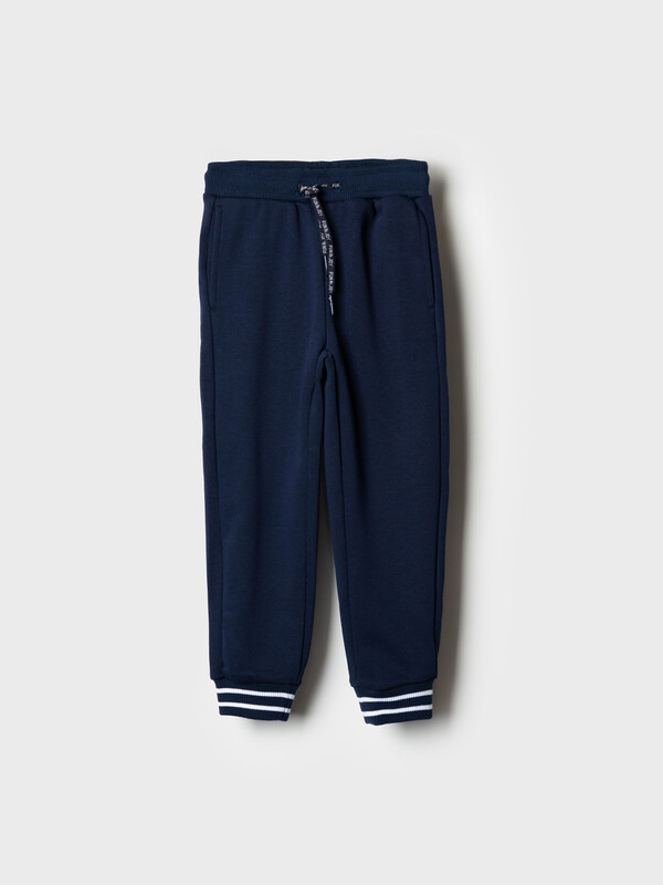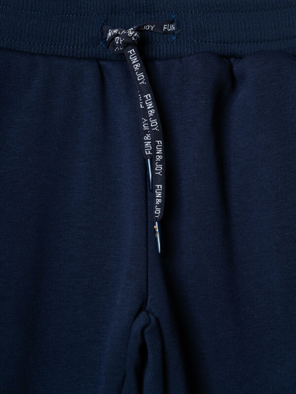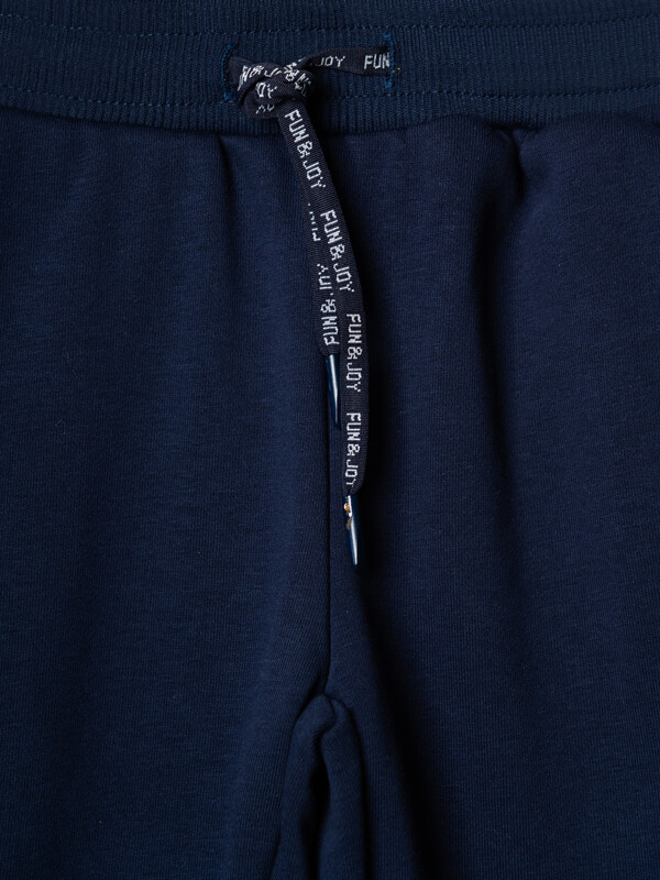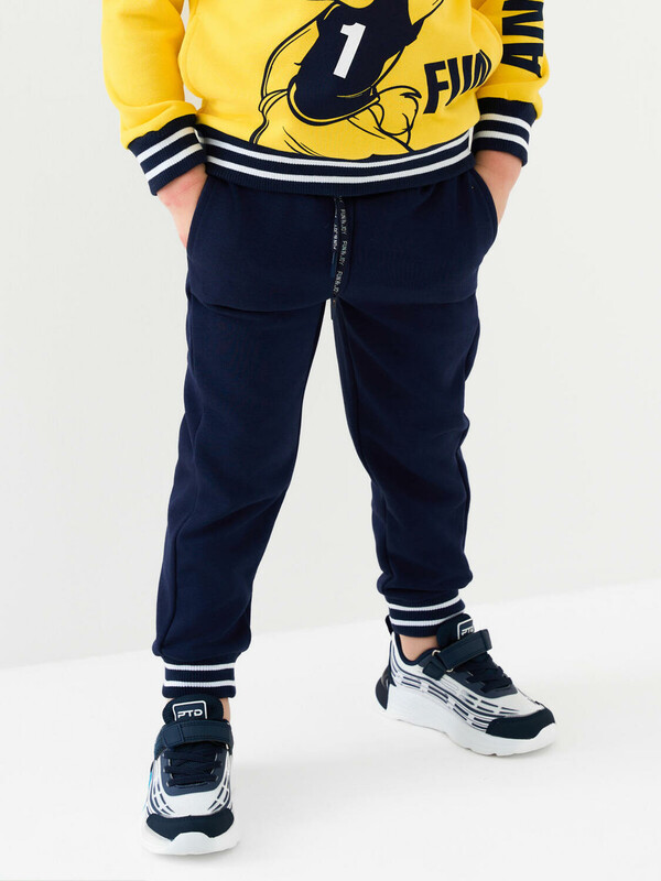 Трикотажные детские брюки джоггеры для мальчика. Модель выполнена из футера без начеса. Пояс на широкой резинке дополнен декоративным шнурком с надписью "FIND & JOY". По бокам расположены удобные карманы. Низ брюк оформлен эластичными манжетами с контрастными полосками. Брюки подойдут для повседневной носки и активного отдыха.