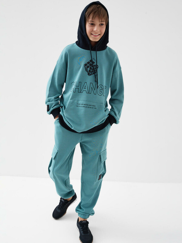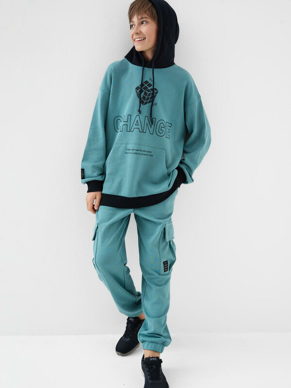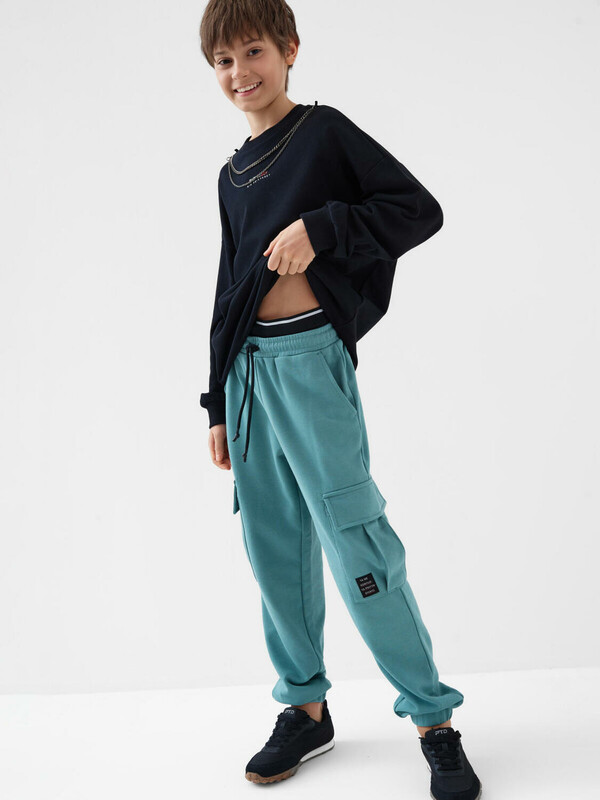 Брюки джоггеры из трикотажа для мальчика подростка. Свободный крой. Пояс на резинке со шнурком позволяет регулировать посадку. Спереди два удобных кармана, а по бокам — большие карманы с клапанами на липучке. Один из карманов украшен стильным шевроном с надписью. Внизу брюки собраны на манжеты, что делает образ более динамичным.