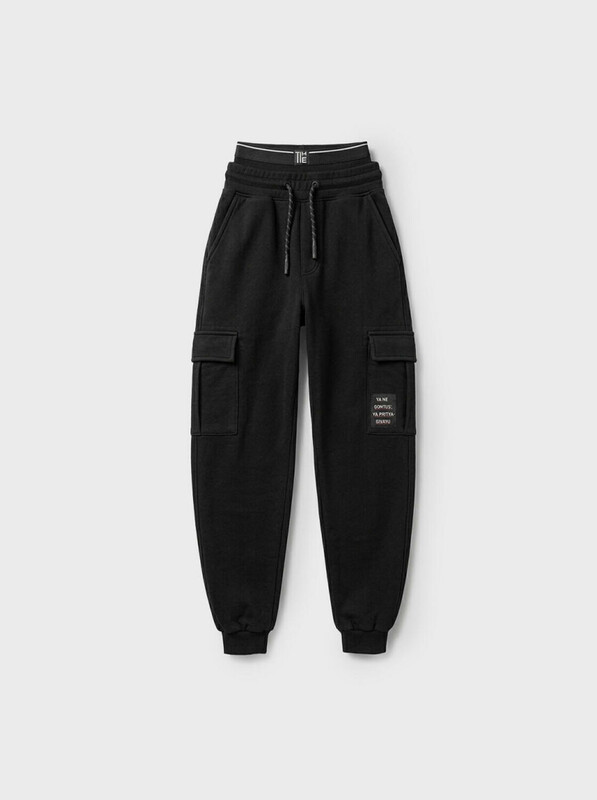 Брюки-джоггеры для мальчика подростка. Выполнены из хлопкового трикотажа футер без начеса. Модель свободного кроя со средней посадкой на талии. Пояс выполнен на резинке, дополнительно регулируется шнурком. По бокам — удобные карманы, а на уровне бедер расположены накладные карманы-карго. В нижней части брючин предусмотрены манжеты на резинке для лучшей фиксации.
