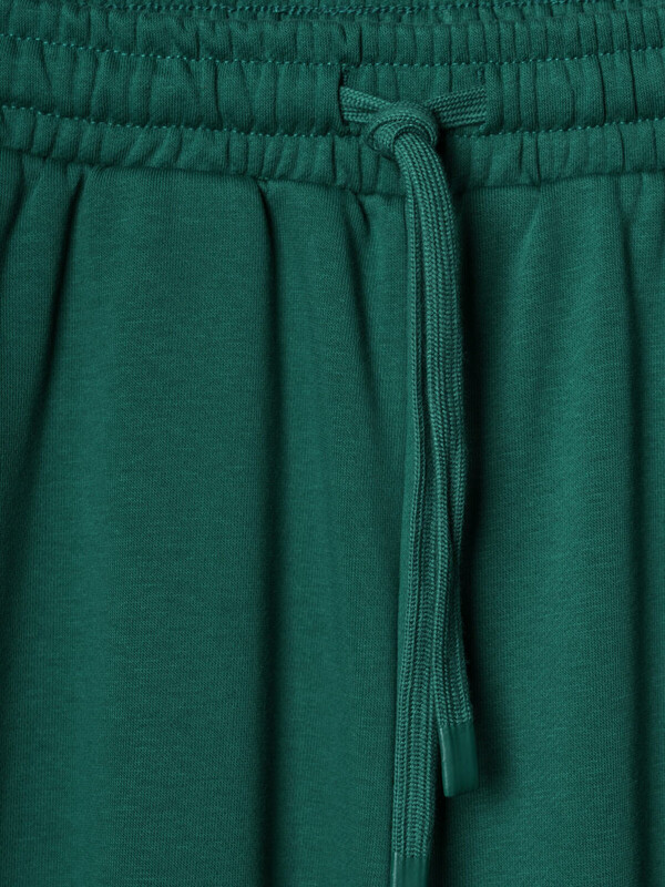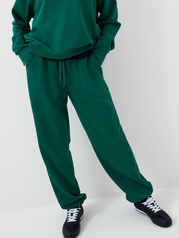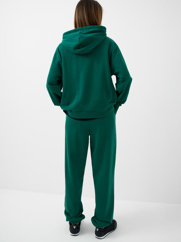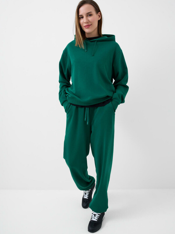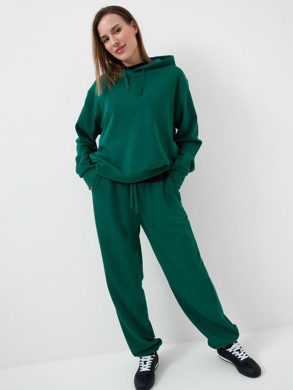 Спортивные женские брюки. Выполнены из хлопкового трикотажа футер без начеса. Модель свободного кроя со средней посадкой на талии. Пояс на резинке, дополнительно регулируется шнурком. По бокам — удобные карманы. В нижней части брючин предусмотрена резинка для лучшей посадки.