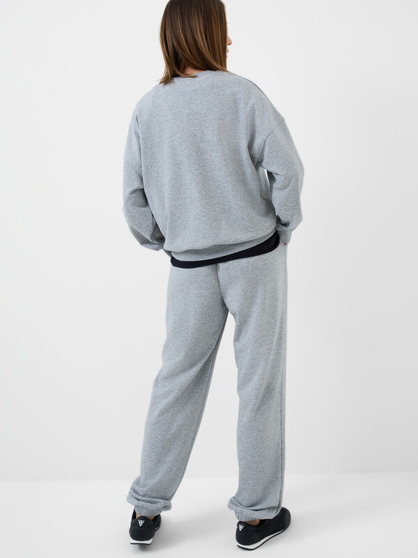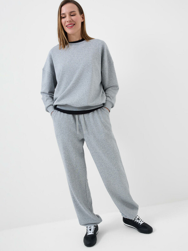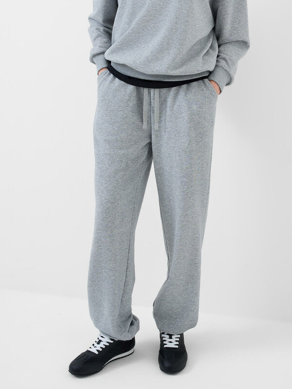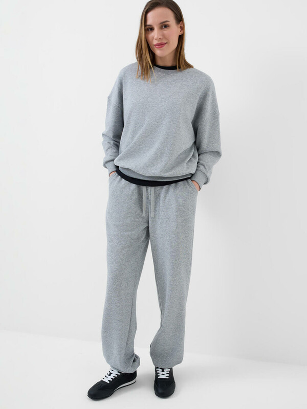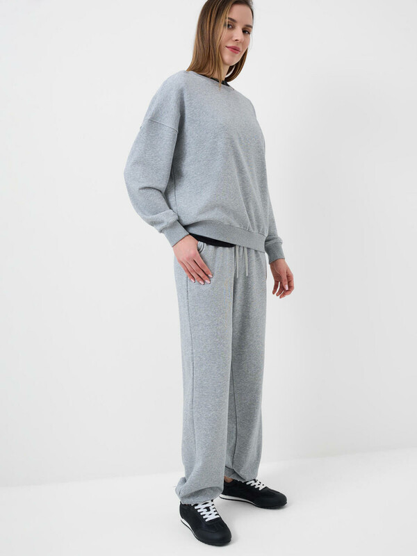 Спортивные базовые женские брюки. Выполнены из хлопкового трикотажа футер без начеса. Модель свободного кроя со средней посадкой на талии. Пояс выполнен на резинке, дополнительно регулируется шнурком. По бокам — удобные карманы. В нижней части брючин предусмотрена резинка для лучшей посадки.