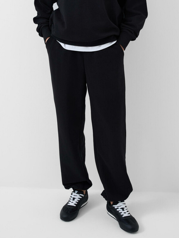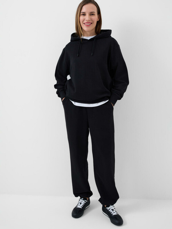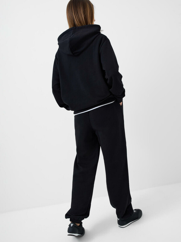 Спортивные базовые женские брюки. Выполнены из хлопкового трикотажа футер без начеса. Модель свободного кроя со средней посадкой на талии. Пояс на резинке, дополнительно регулируется шнурком. По бокам — удобные карманы. В нижней части брючин предусмотрена резинка для лучшей посадки.