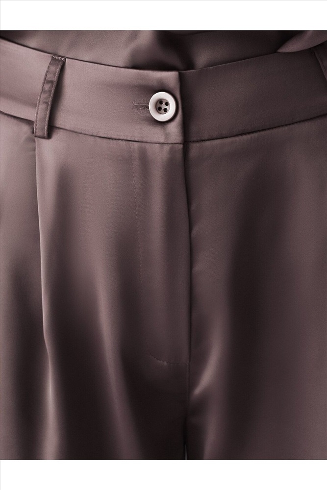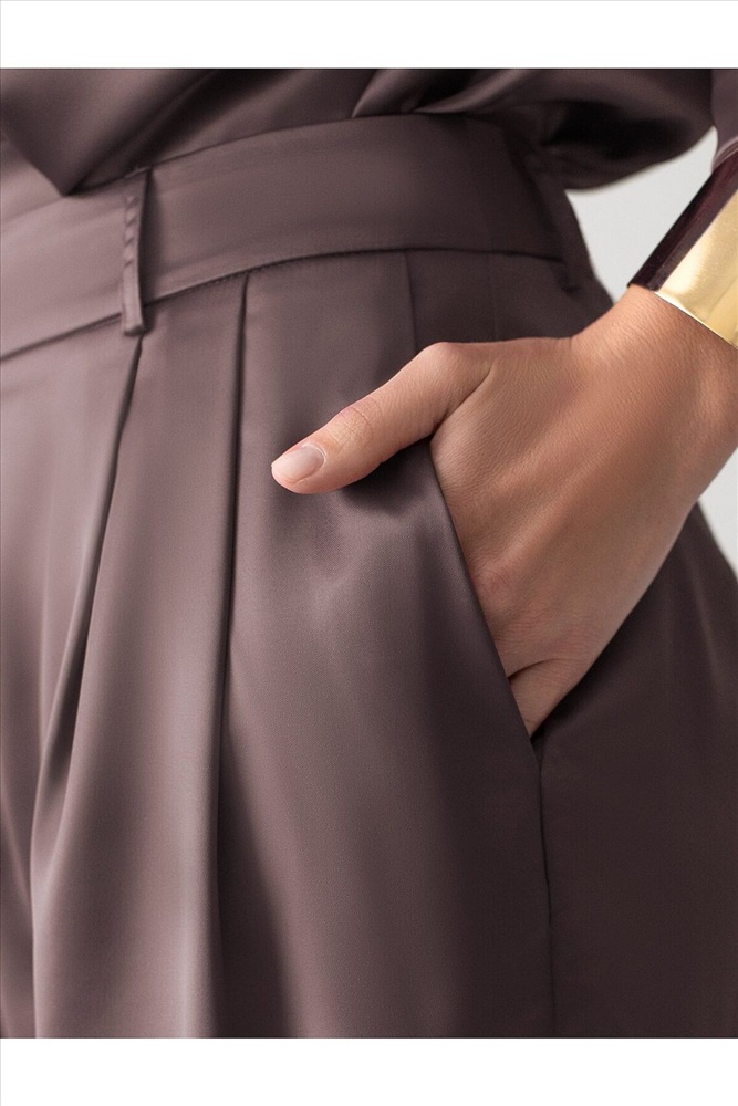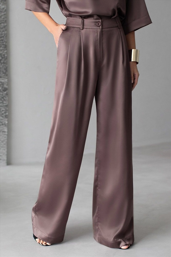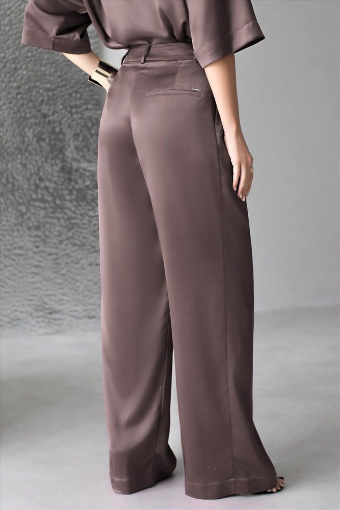 Брюки палаццо кофейного цвета из струящегося сатина, который придает образу эффектный и стильный вид. Мягкий сатин приятен к телу, в них комфортно на протяжении долгой носки. Брюки длиной в пол визуально вытягивают силуэт и подходят как для высоких, так и для женщин низкого роста. Модель идеально садится на большие размеры, не сковывая движений. Благородный материал обеспечивает не только привлекательный внешний вид, но и ощущение легкости в носке. Высокая посадка выгодно подчеркивает фигуру, добавляя изящества и современного шарма, они струятся при каждом движении. Нарядные широкие брюки сочетают в себе красоту и функциональность, созданы для женщин, которые ценят дорогой внешний вид без лишних усилий, идеально подходят для создания праздничного образа, сочетая комфорт и элегантность. Брюки универсальны: их легко сочетать с блузками, топами или жакетами для создания образа как на событие, так и для повседневных выходов. Такой фасон остается актуальным вне зависимости от сезона или модных тенденций.