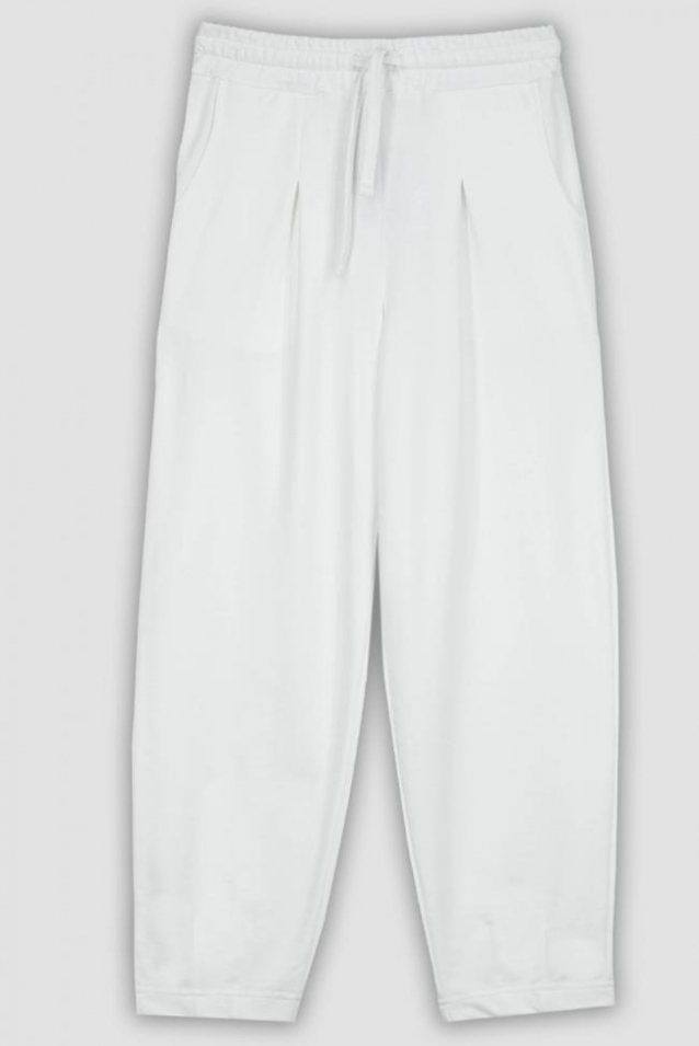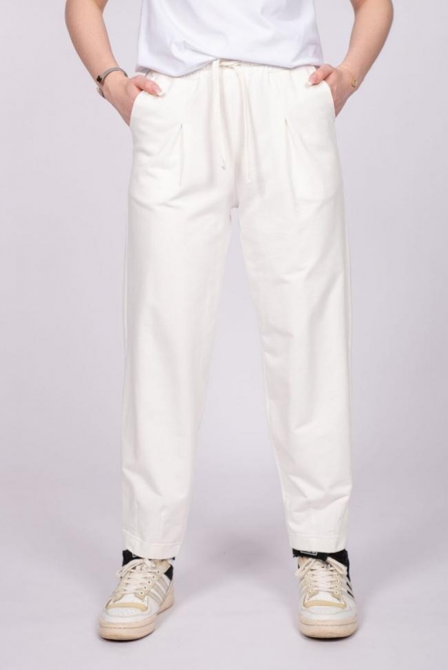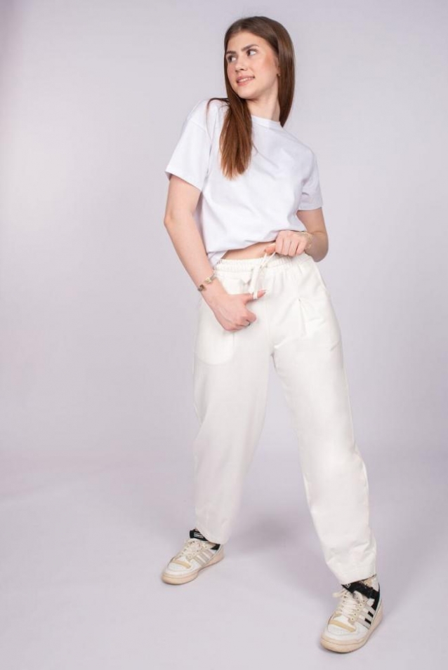 Брюки женские бананы зауженные к низу. Пояс отрезной в цвет изделия, выполнен из основного полотна, с эластичной тесьмой внутри. По поясу шорт вставлен плоский утягивающий шнурок, шириной 0,8 см, цвет серый меланж, низ шнурка подвернут и застрочен. Вдоль пояса шнурок закреплен отстрочкой на поясной машине. На изделии выполнены карманы с отрезным бочком и отлетной мешковиной, вход в карман обтачной. По линии талии передней половинке встречная складка зстрочена 6 см, нитки в цвет изделия. По низу брюк 2 вытачки по передней половинке и 2 вытачки по задней половинке, стачиваются на прямой строчке, нитки в цвет изделия. Низ изделия обработан швом вподгибку. Модель рассчитана на рост 164-170