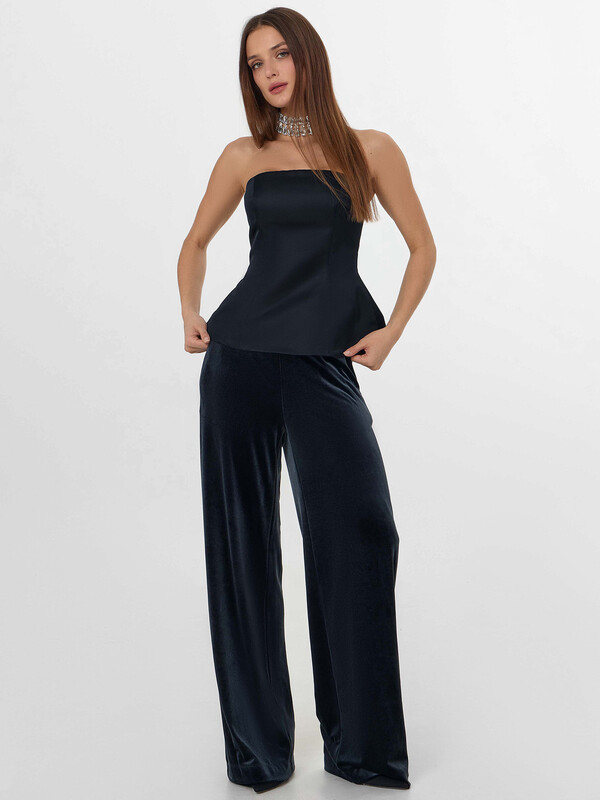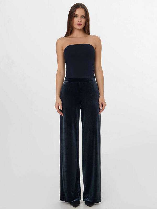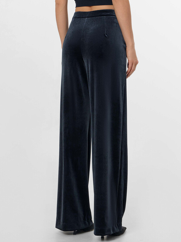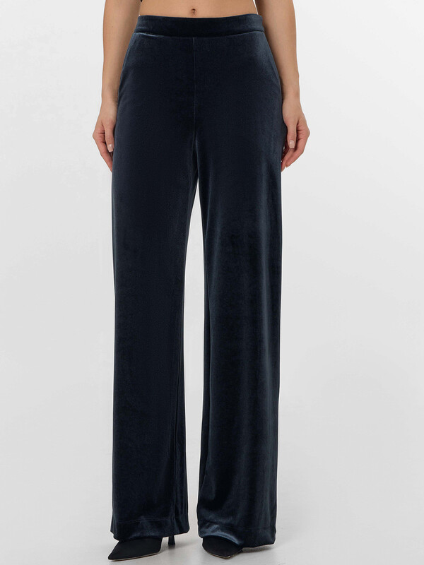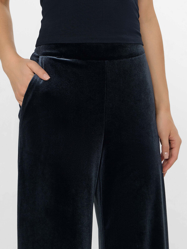 Брюки свободного силуэта. Перед и спинка цельнокроеные. Пояс отрезной, в боковом шве потайная молния Invisible №4,5мм. Спереди находятся карманы с отрезным бочком, подкладка из основного полотна. Низ изделия вподгибку.