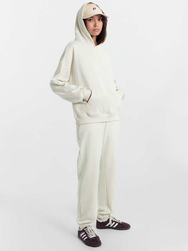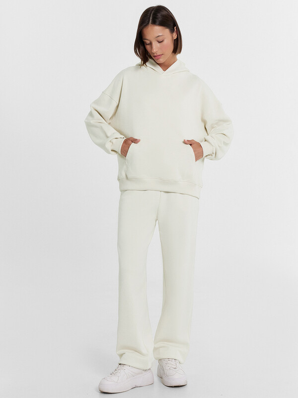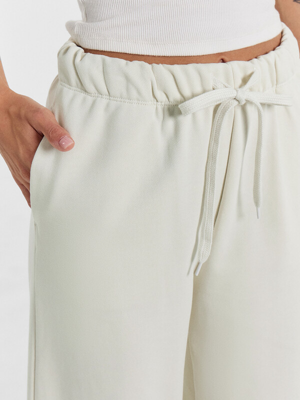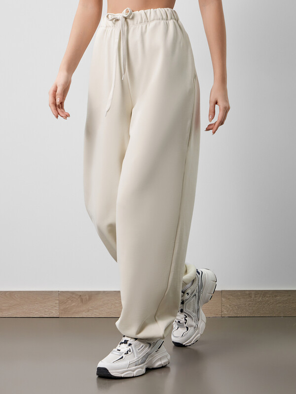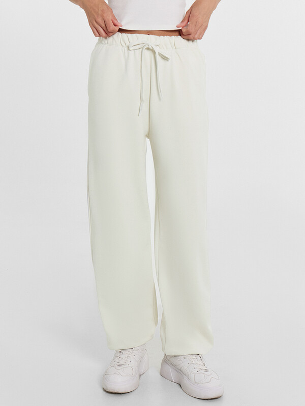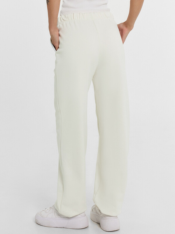 Брюки прямые свободные. Пояс цельнокроеный с эластичной тесьмой внутри. С внешней стороны пояса пробиты петли и втянут шнур (8KXW-1 8мм.) с узлом на концах. В боковых швах обработаны карманы. Подкладка кармана из основного полотна. Низ брюк обработан швом впобгибку с эластичной тесьмой внутри.
