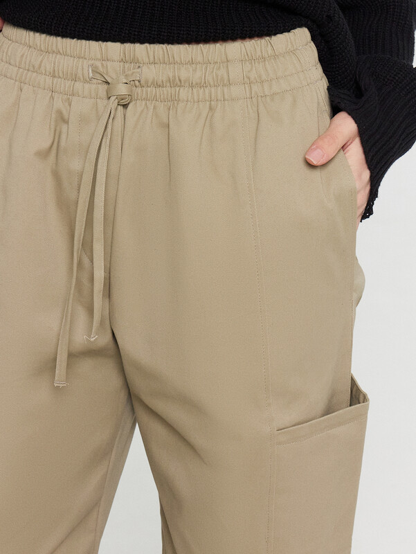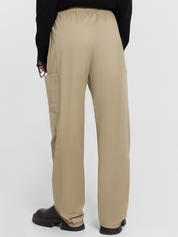 Брюки с отрезным бочком. В рельевах обработаны горизонтальные карманы.