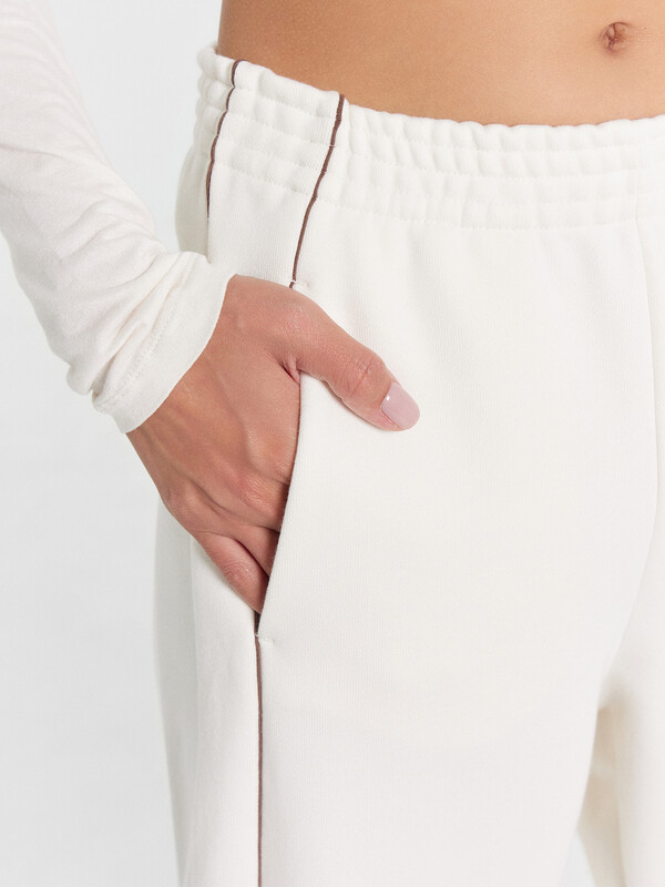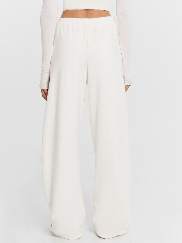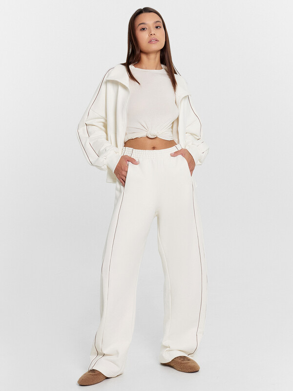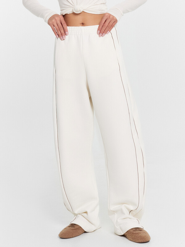 Брюки женские свободного силуэта из футера. Пояс цельнокроеный с эластичной тесьмой внутри. По поясу проложены отделочные строчки. В боковых швах отрезной лампас из футера с кантами из кулирки. Карманы в боковом шве, подкладка кармана из кулирки. Брюки скроены немного подковой. Брюки полной длины, по низу немного присобираются.