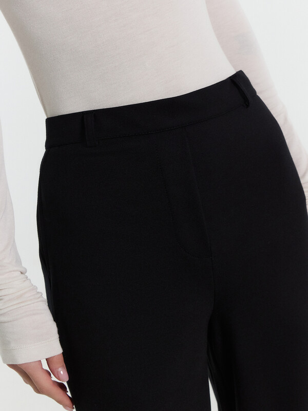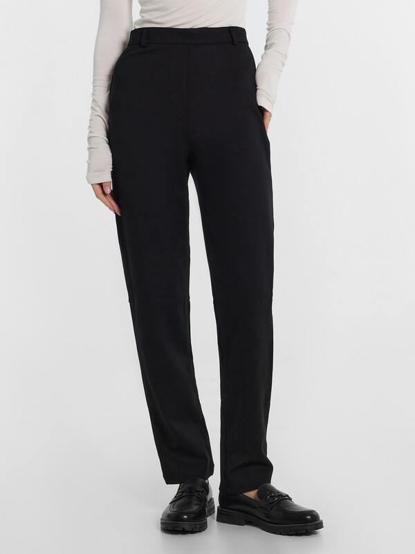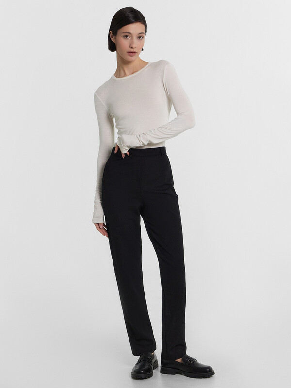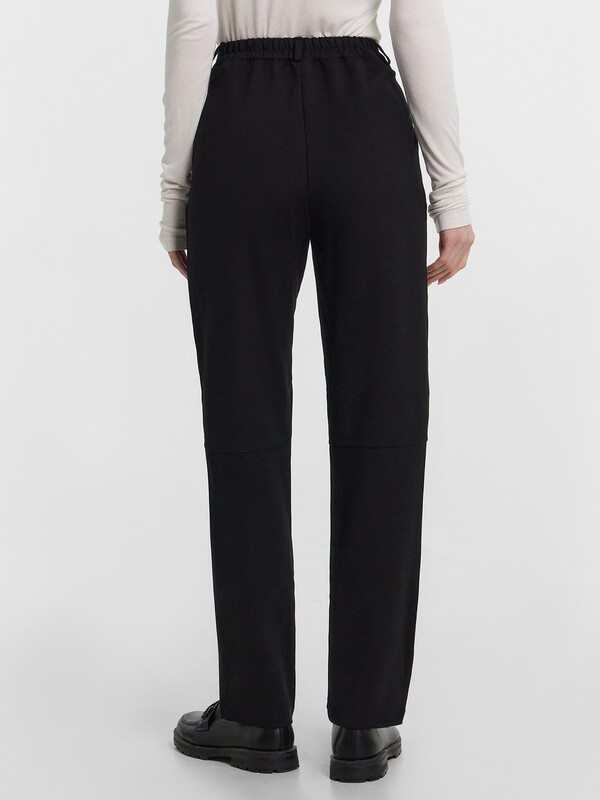 Брюки прямого силуэта зауженные к низу. Пояс отрезной. Задняя часть пояса присборена на эластичную тесьму. По поясу настрочены шлевки. На деталях переда обработана имитация карманов. На правой передней половинке отстрочена декоративная строчка - имитация гульфика. В боковом шве застежка на потайную молнию. На задних половинках в районе колен декоративные горизонтальные подрезы. Нижние срезы брюк обработаны швом вподгибку на 2х игольной плоскошовной машине.