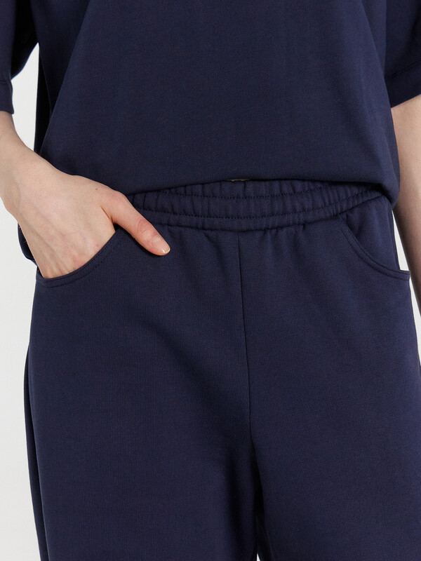 Женские брюки, сочетающие в себе современный стиль и непревзойденное удобство. Модель свободного кроя и эластичной талией на кулиске гарантирует идеальную посадку и комфорт в течение всего дня. А практичность добавляют боковые карманы, а также задний накладной карман. Изделие выполнено из мягкого футера с теплым подчесом. Ощутите свободу движения и уверенность в каждом шаге с брюками Mark Formelle!