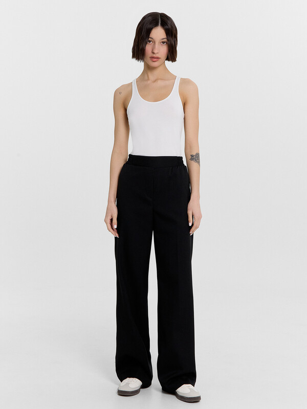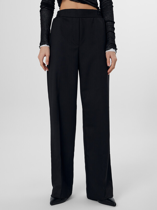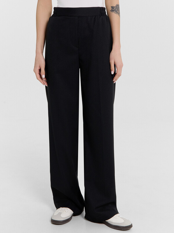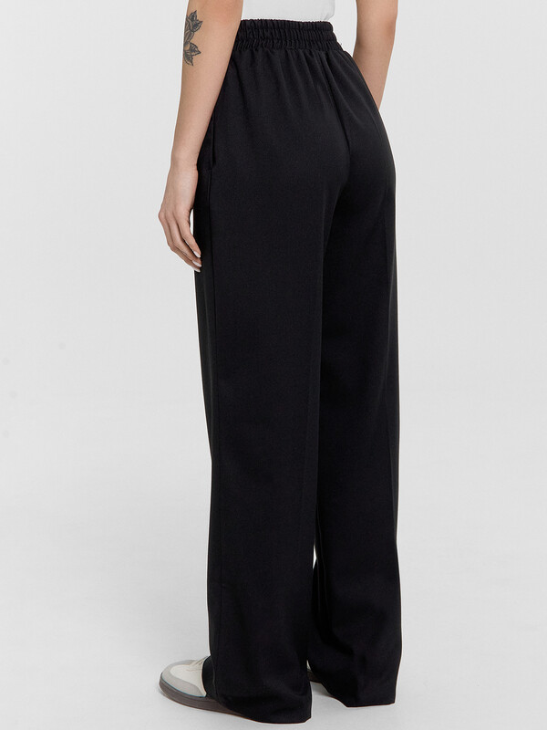 Брюки прямые, свободные. Посадка высокая.Пояс отрезной состоит из двух частей. Задняя часть с эластичной тесьмой внутри. В боковых швах обработаны карманы. На правой передней половинке проложена декоративная строчка - имитация гульфика. На передних и задних половинках заутюжены стрелки. Нижние срезы брюк обработаны швом вподгибку