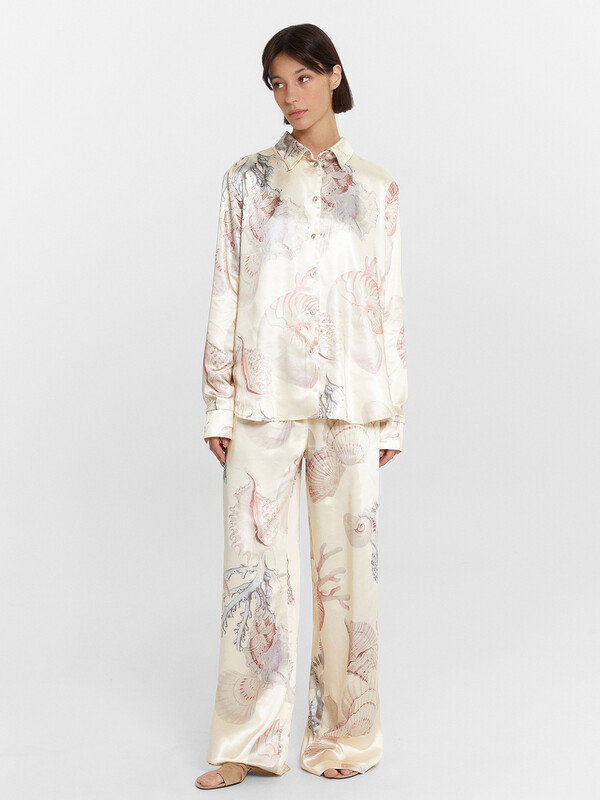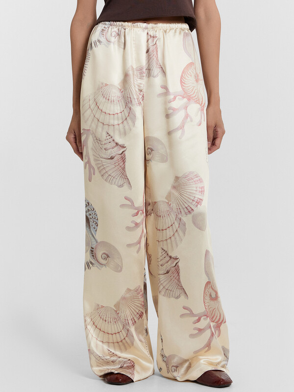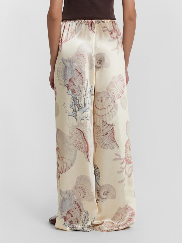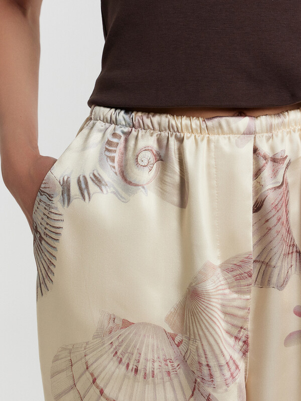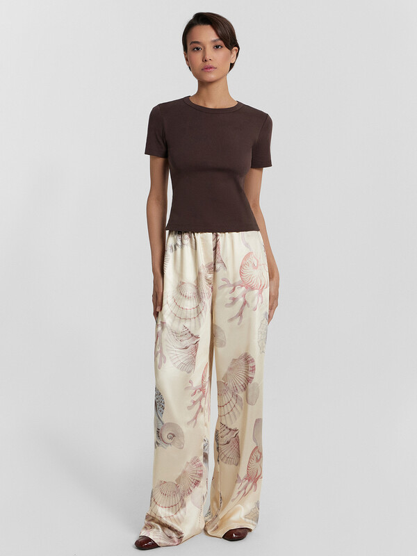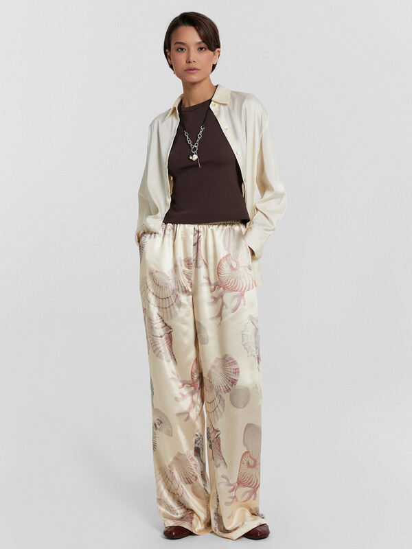 Брюки прямые свободные, посадка средняя. Пояс цельнокроеный с эластичной тесьмой внутри (20мм 20RV). С внутренней стороны пояса пробиты петли и втянут шнур-бейка из основного полотна. На деталях переда обработаны карманы-хулиганы. Подкладка карман из основного полотна. На правой детали переда имитация гульфика. Нижние срезы обработаны швом вподгибку с закрытым срезом.
