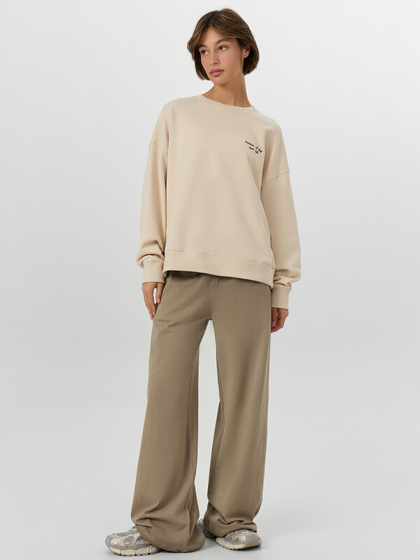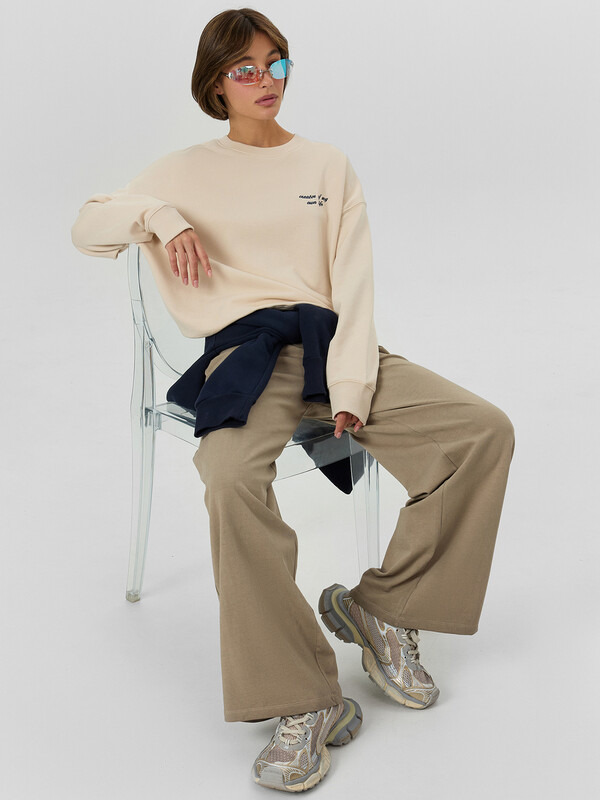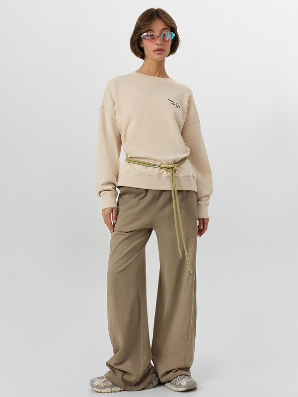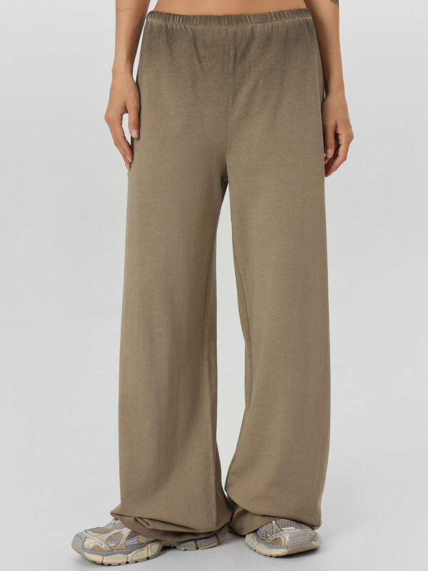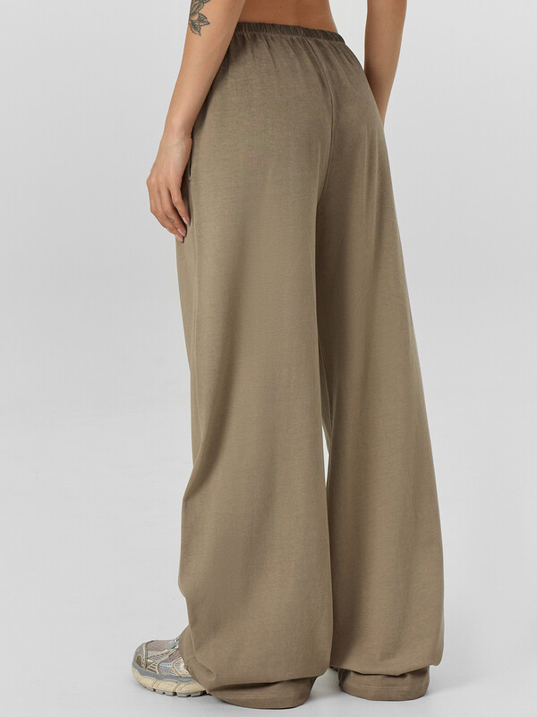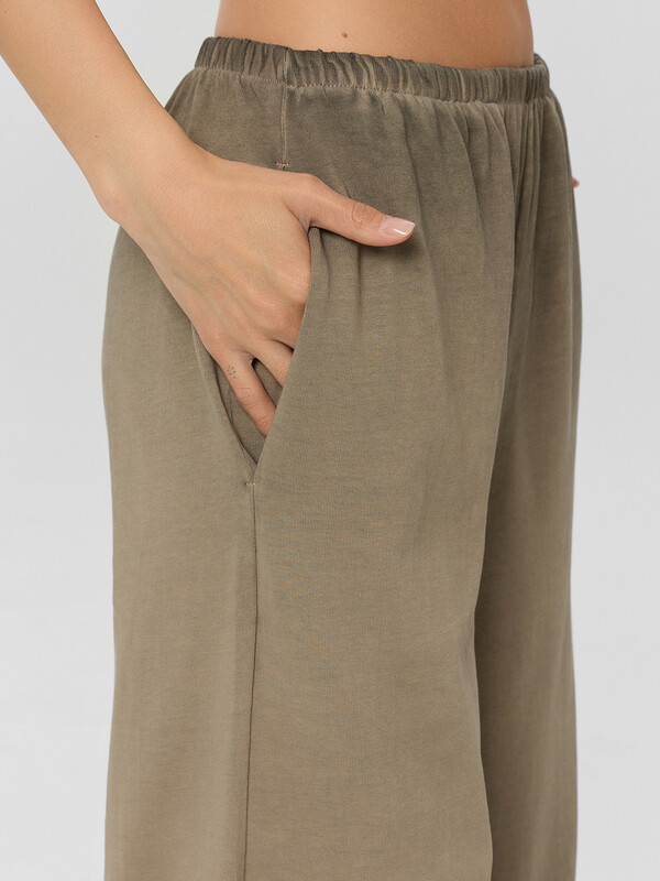 Брюки прямые, свободного силуэта. Посадка средняя, сиденье опущено. Пояс цельнокроеный с эластичной тесьмой внутри (вн. 20мм 20RV). В боковых швах обработаны карманы. Подкладка кармана из основного полотна. Нижние срезы обработаны швом вподгибку.