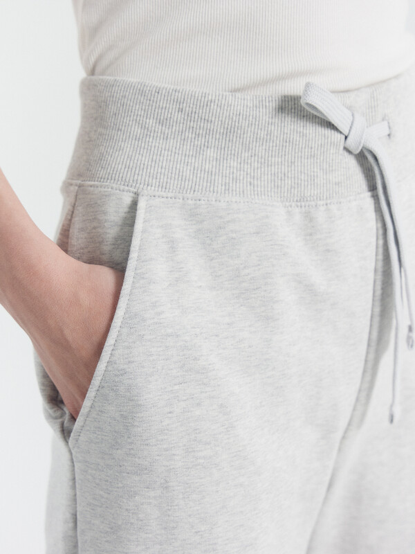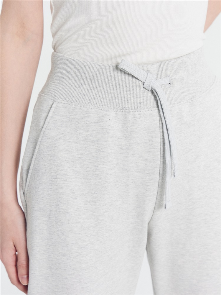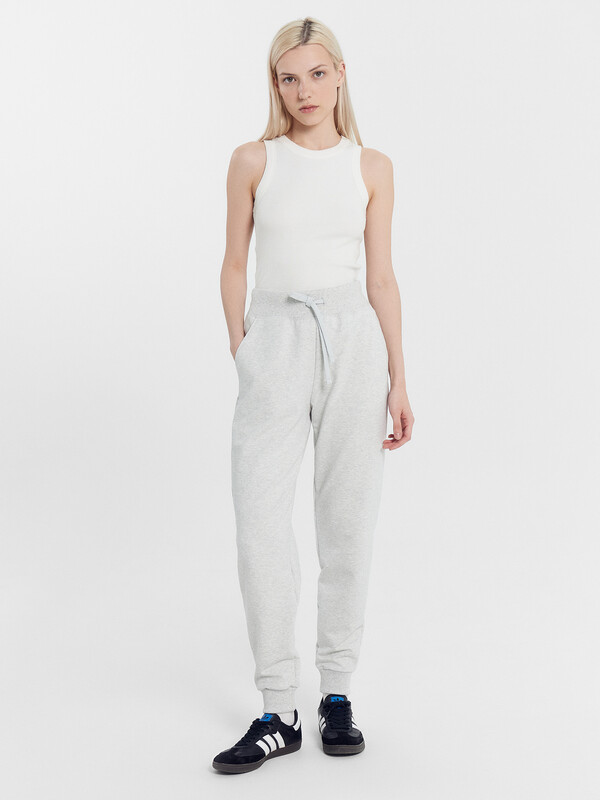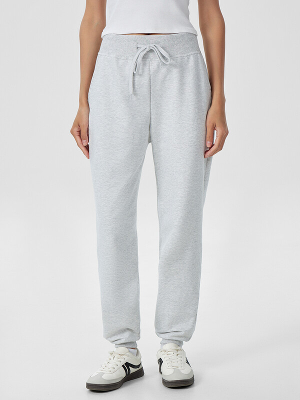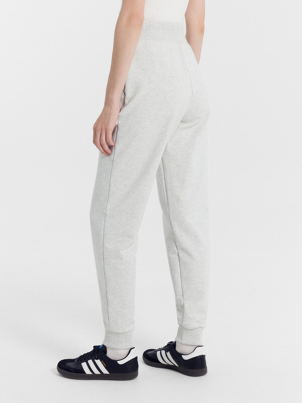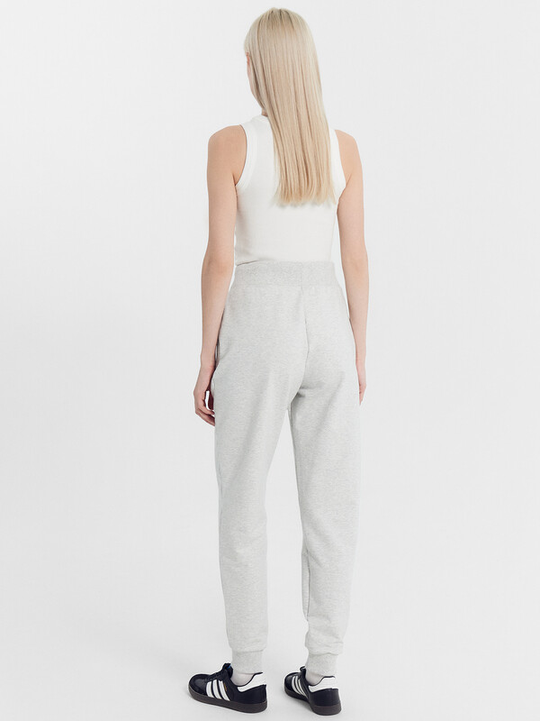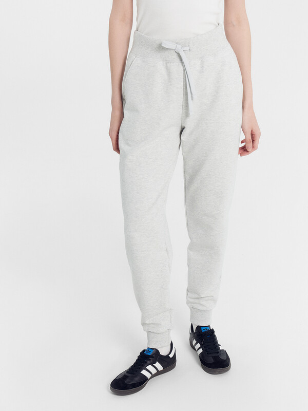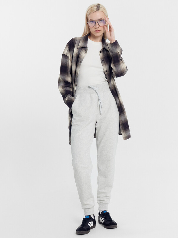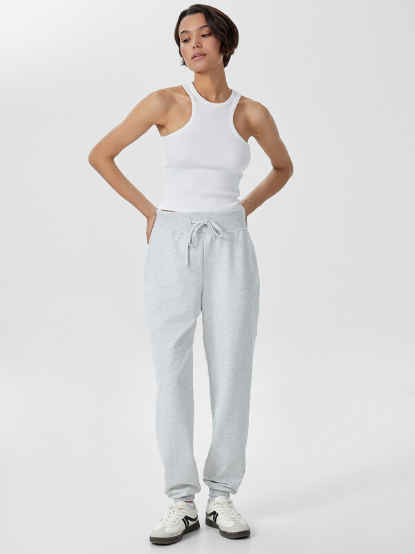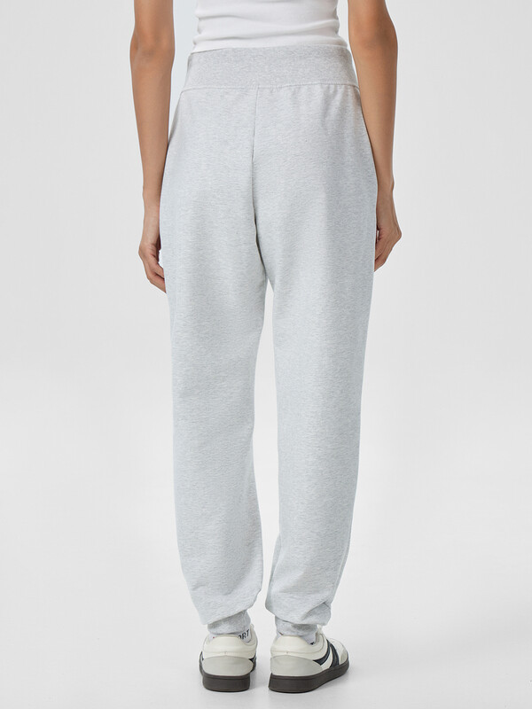 Брюки изготовлены из трикотажного полотна футер. Брюки прямые с высокой посадкой. Пояс отрезной из рибаны с эластичной тесьмой внутри. В передней части пояса с лицевой стороны пробиты петли и втянут шнур. Шов втачивания пояса распошит. Спереди обработаны карманы хулиганы. По низу брюк отрезные манжеты из рибаны.
