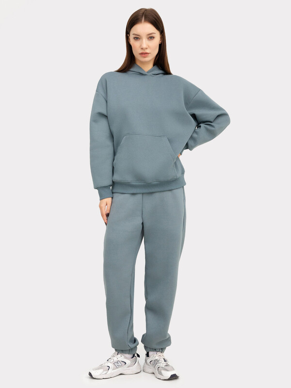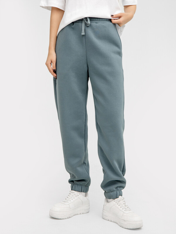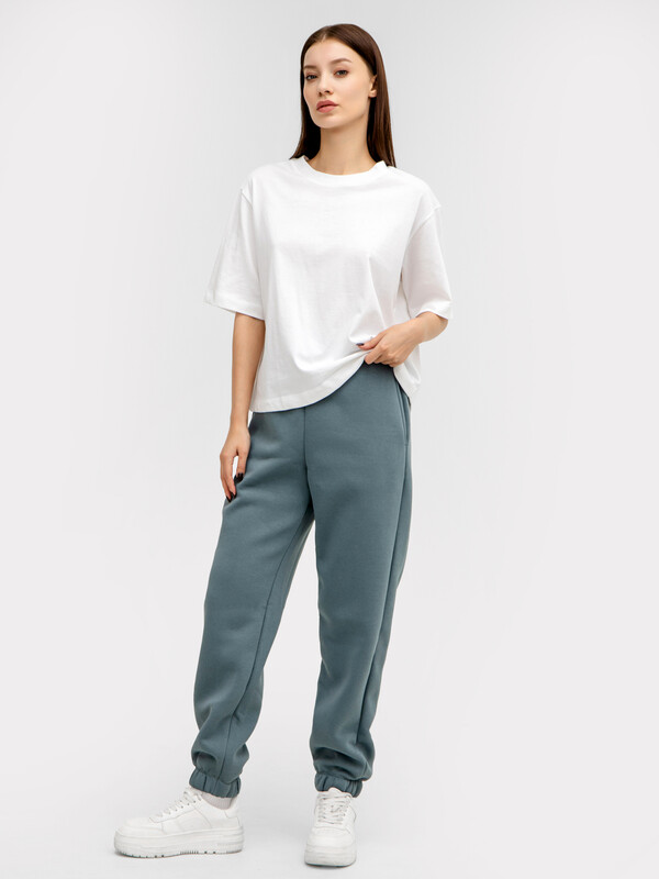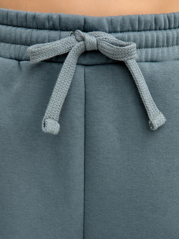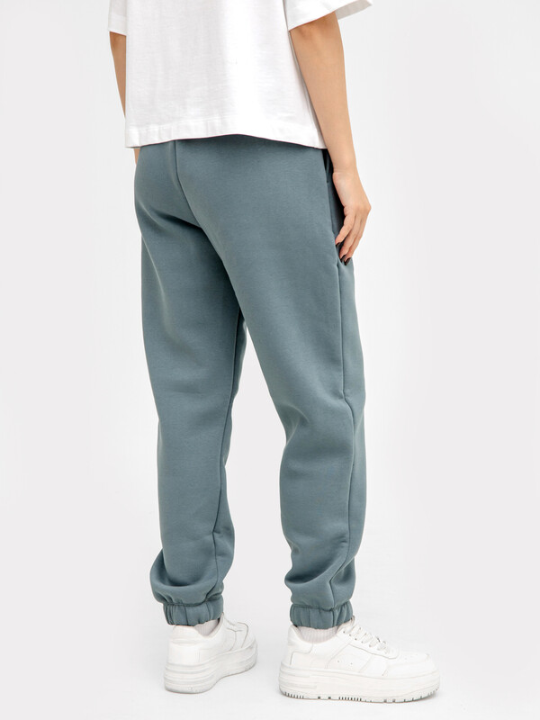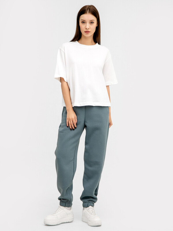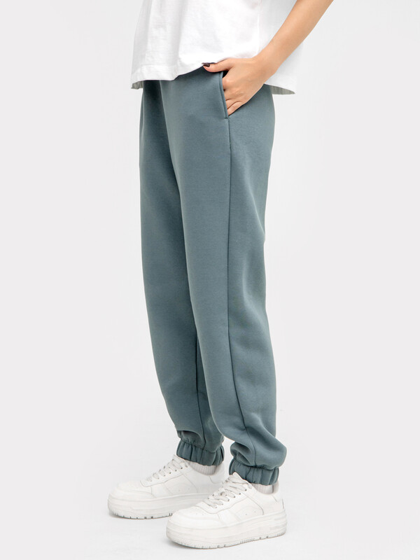 Брюки изготовлены из трикотажного полотна футер. Брюки свободного силуэта. Сиденье немного спущено. В боковых швах обработаны карманы. Подкладка карманов из кулирки.