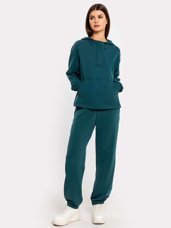 Брюки свободного силуэта, с высокой посадкой. Пояс отрезной с эластичной тесьмой внутри. В боковых швах обработаны карманы. Нижние срезы обработаны швом вподгибку с эластичной тесьмой внутри 57% вискоза; 33% полиэстер; 10% эластан Вид застежки: без застежки Декоративные элементы: без элементов Модель брюк: джоггеры Назначение: спорт Пол: Женский Предмет: Брюки Тип карманов: в шве Тип посадки: высокая Утеплитель: без утепления Уход за вещами: деликатная стирка при 30 градусах длина брючин по внутр. шву, см: 66,2 длина изделия по боковому шву - низ, см: 93,5 фактура материала: интерлок ширина брючин - низ, см: 13,5 Комментарии к товару