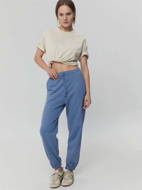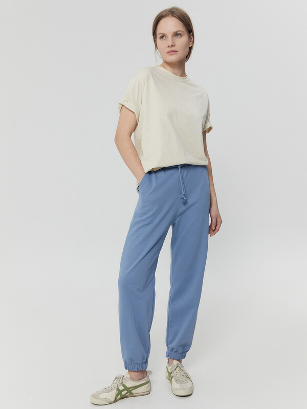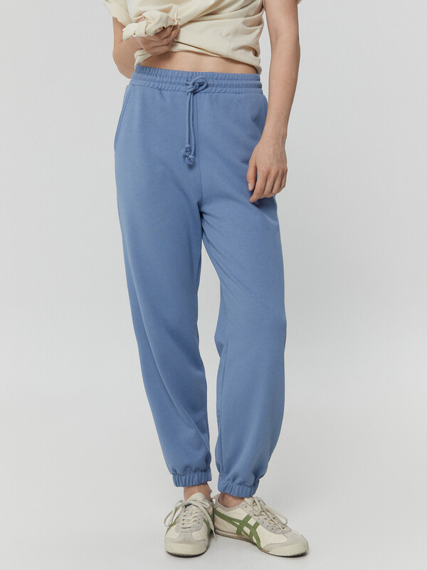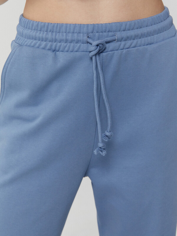 Пояс отрезной с эластичной тесьмой внутри. По переду пояса с внешней стороны пробиты петли и втянут шнур. По переду обработаны карманы-хулиганы, подкладка кармана из основного полотна. Нижние срезы брюк обработаны швом вподгибку с эластичной тесьмой внутри.