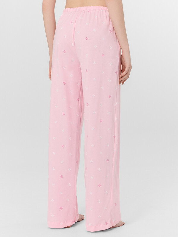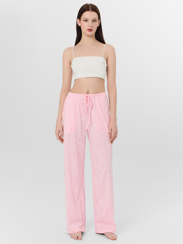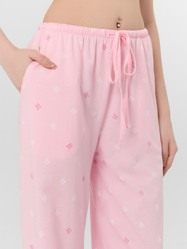 Домашние брюки с принтом — это уют и свобода в каждой детали. Высокая посадка и свободный силуэт из мягкого хлопкового трикотажа обеспечивают комфорт и полную свободу движений, идеально подходя для отдыха дома.