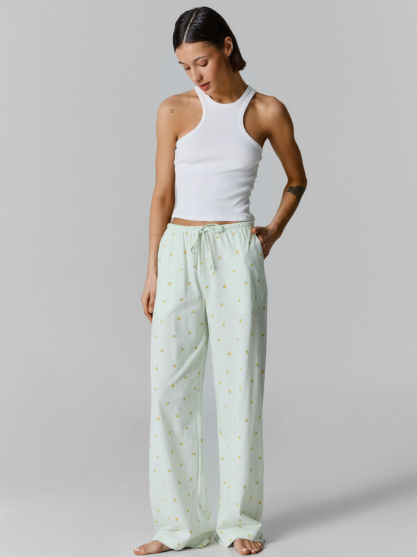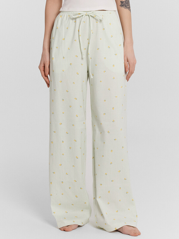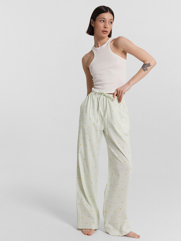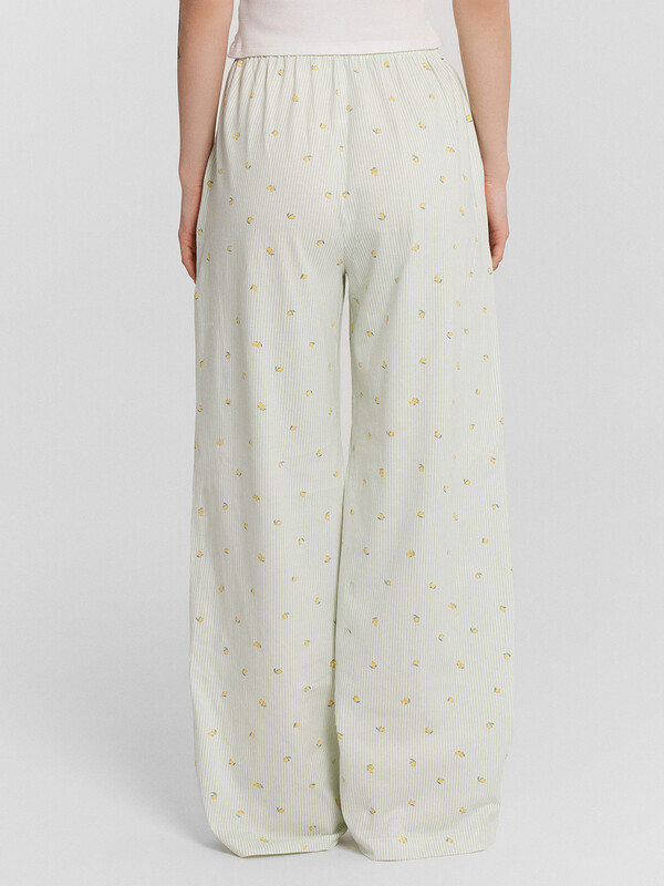 Брюки с посадкой на талии свободного силуэта. Пояс цельнокроеный с резиной внутри 20RV. По центру пояса пробиты петли, протянута бейка из основного полотна. На передних деталях карманы «хулиганы». Низ изделия застрочен швом в подгибку.