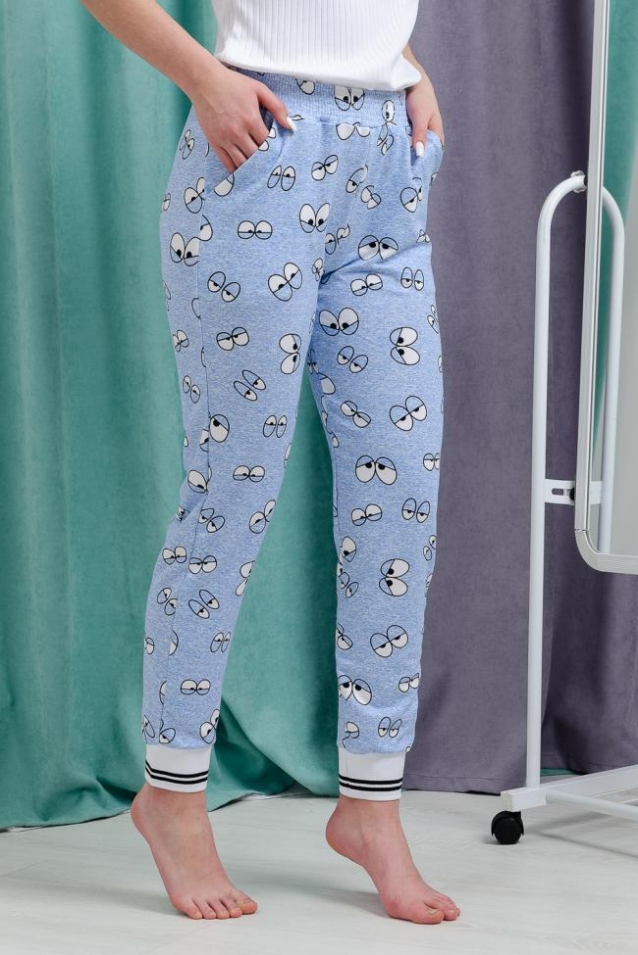 Брюки на поясе, с боковыми карманами, с эластичным манжетом внизу.