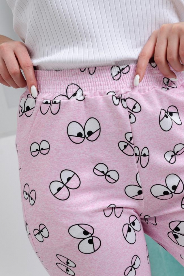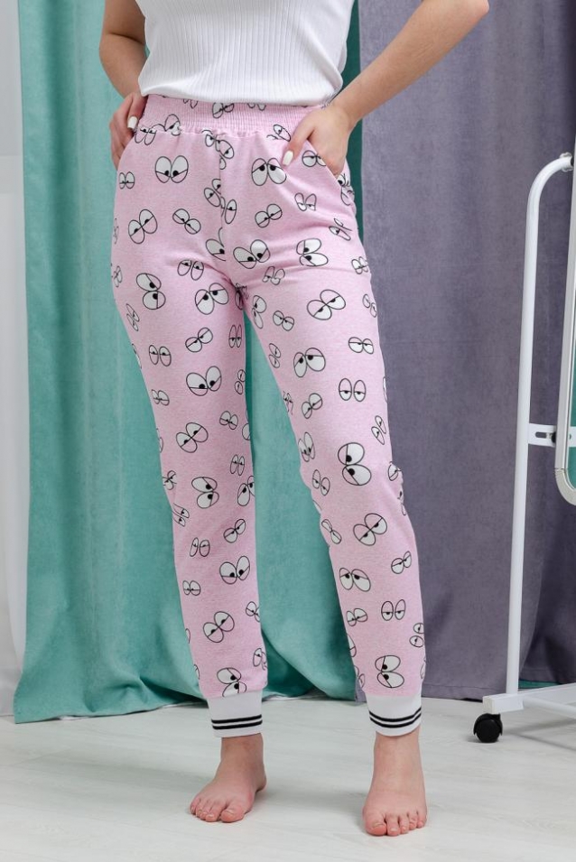 Брюки на поясе, с боковыми карманами, с эластичным манжетом внизу.