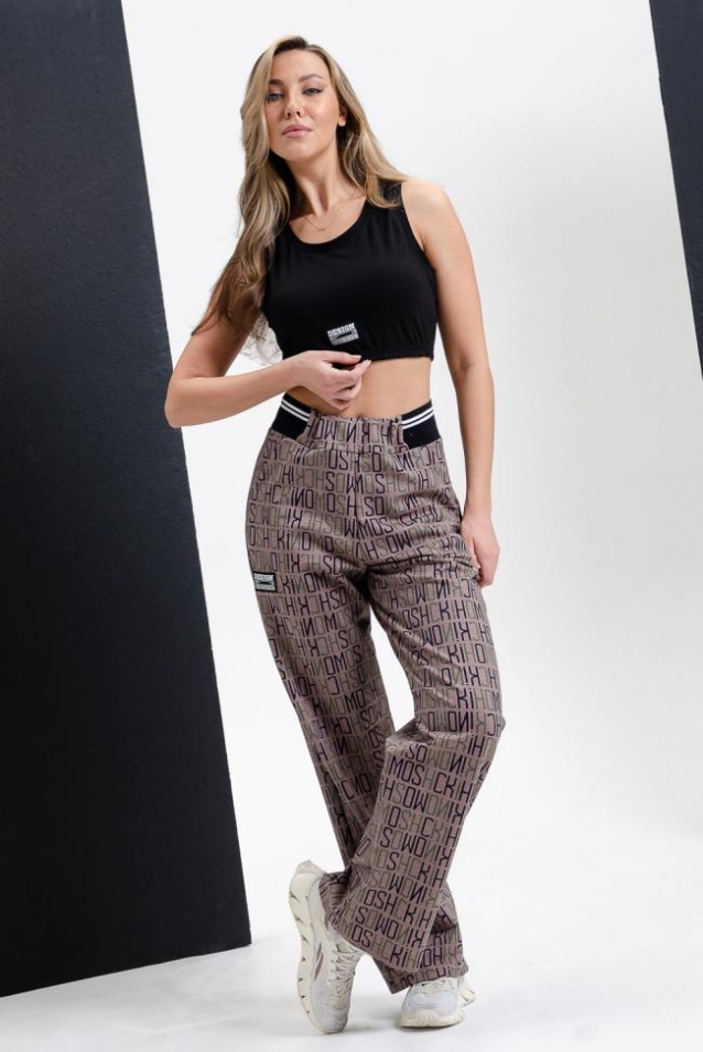 Брюки прямые, с боковыми карманами, на поясе. Боковые вставки пояса выполнены из кашкорсе с лампасами.