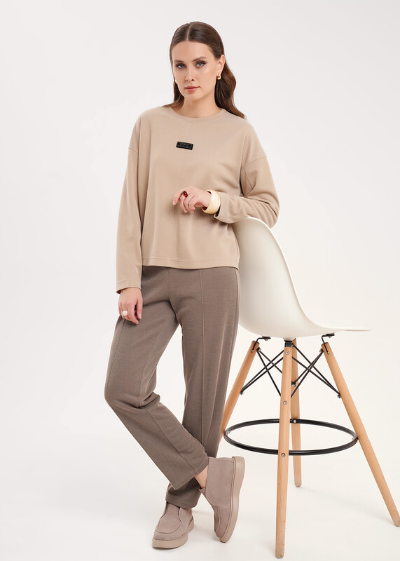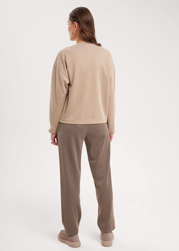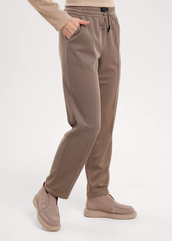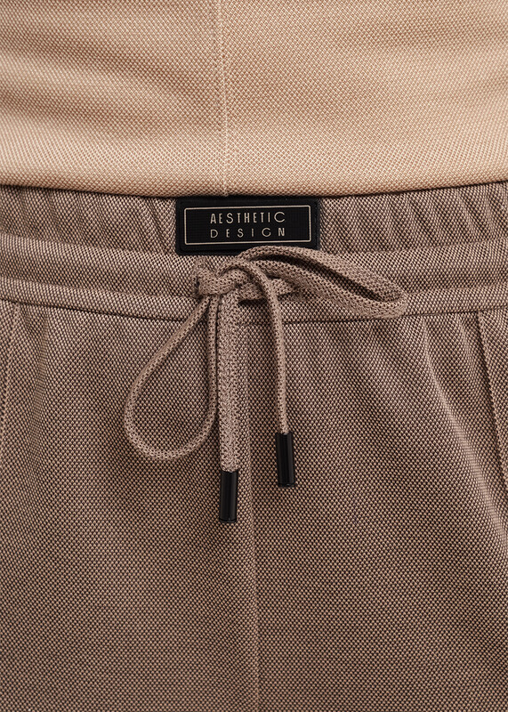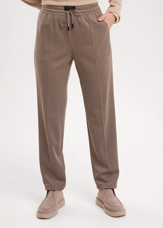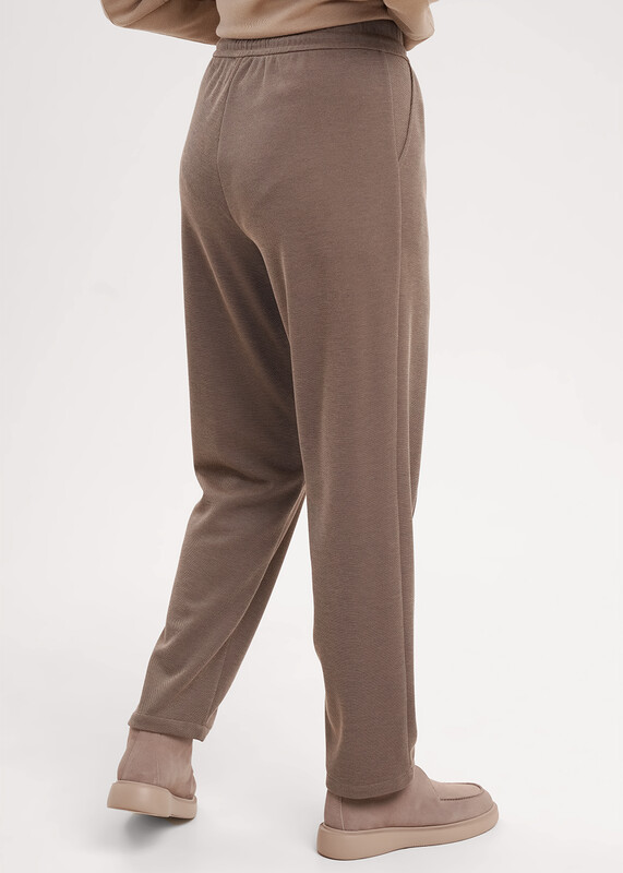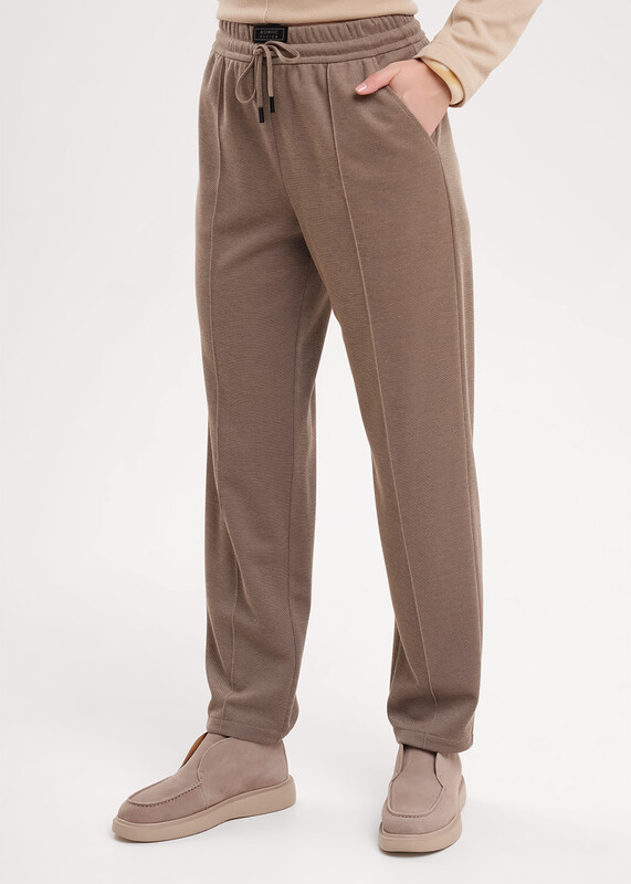 Брюки зауженные из трикотажного полотна пике жаккард. По талии притачной пояс на внутренней резинке со шнуром из окантовки, спереди нашивка. Боковые карманы с отрезным бочком. По переду застроченные стрелки.