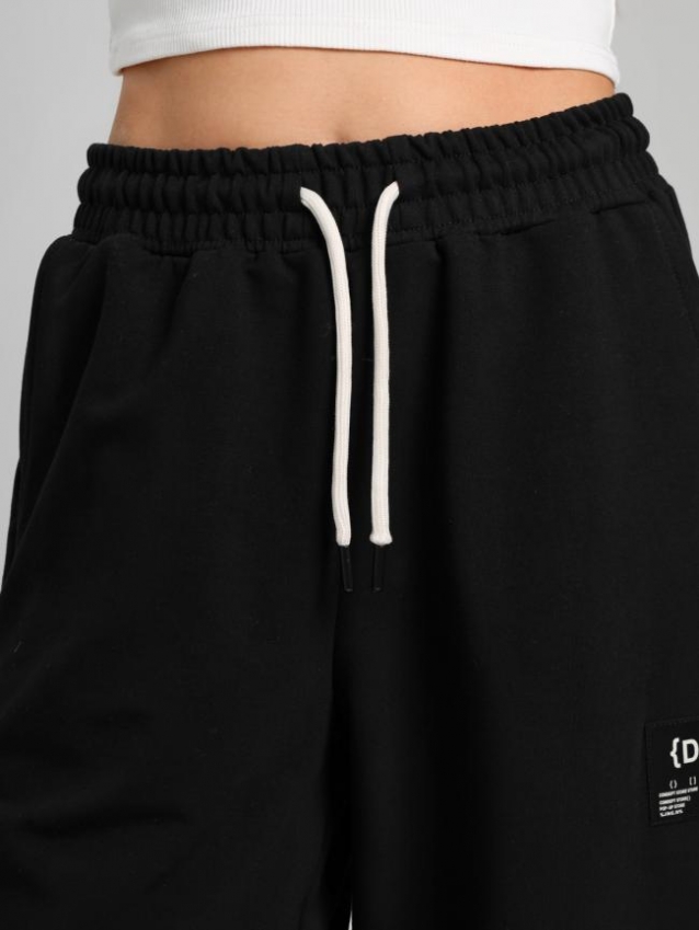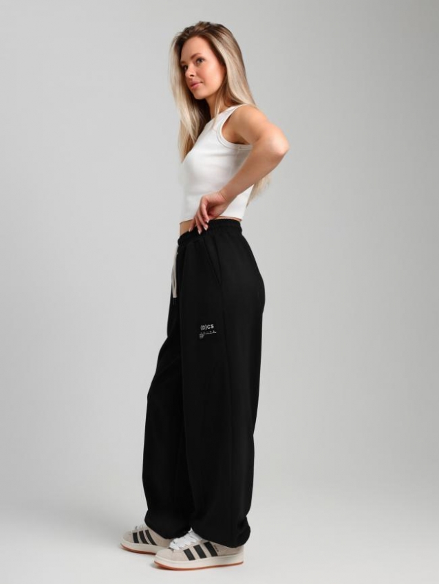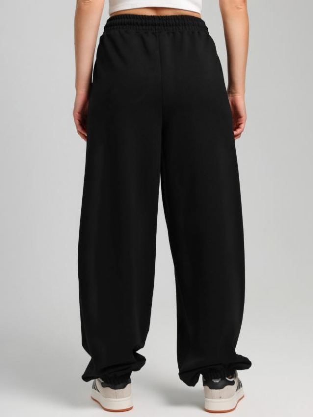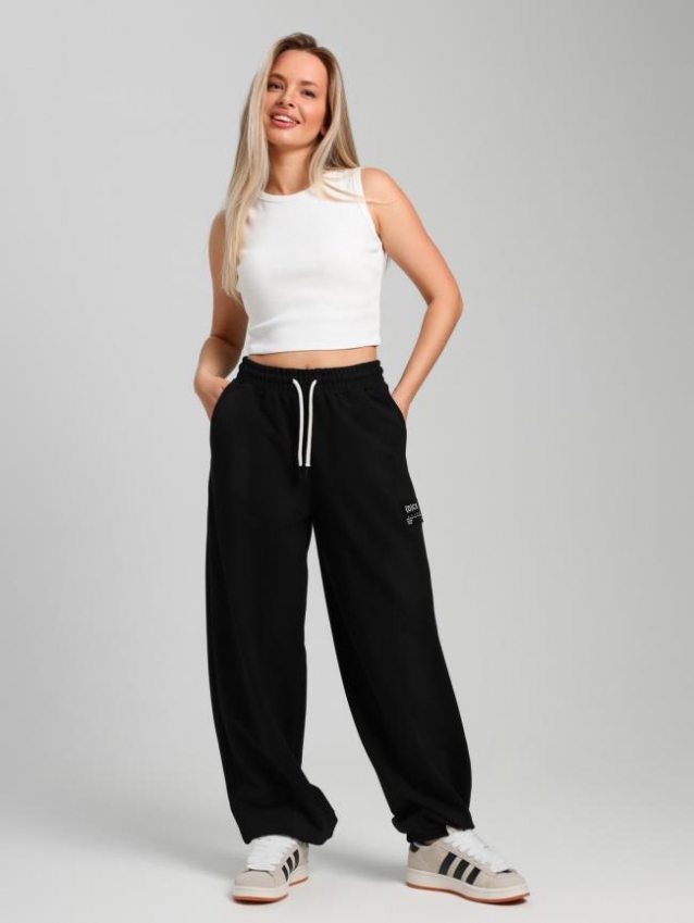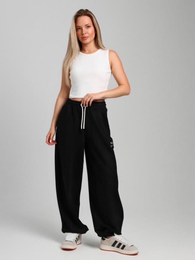 Брюки женские из трикотажного полотна "футер-двунитка", на притачном поясе с эластичной тесьмой внутри, с карманами в боковых швах и отделочными деталями фигурной формы на передних половинах. Нижние срезы брюк обработаны с эластичной тесьмой. По швам притачивания отделочных деталей, декоративных вставок и карманам настрочены отделочные строчки. На левой передней половине брюк ниже кармана настрочен декоративный элемент прямоугольной формы. Через две петли в центре пояса петли продет шнурок, позволяющий регулировать степень прилегания изделия по талии. Комментарии к товару