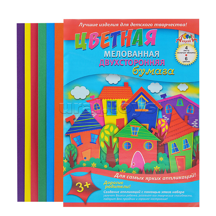 Цветная мелованная двусторонняя бумага, 4 листа, 6 цветов, включая цвета на обложке, формат А4, плотность 60 гр/м2. Внутренний блок - мелованная бумага двойного прокраса, что дает насыщенность цвета. В наборе цвета: красный, синий, коричневый, желтый, зеленый, розовый. Крепление - скоба, обложка - мелованная бумага. Рекомендуется детям от 3 лет.
