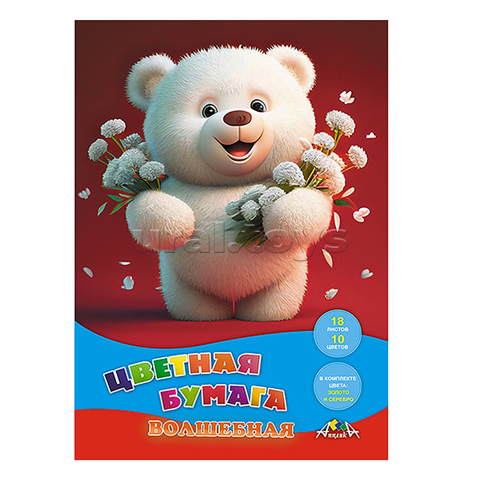 Цветная бумага волшебная, 18 листов, 10 цветов, формат А4, плотность 50 гр/м2. Внутренний блок - офсет №2, двойной прокрас с одной стороны. В наборе цвета: красный, желтый, синий, черный, розовый, оранжевый, зеленый, коричневый и 2 листа мелованной бумаги: золотой и серебряный. Крепление - скоба, обложка - офсетная бумага. Рекомендуется детям от 3 лет.