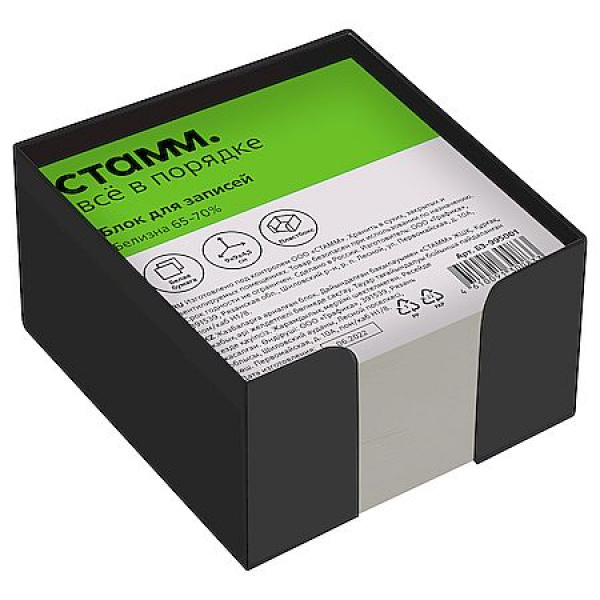 Блок бумаги «СТАММ» в чёрном пластиковом боксе подходит для оперативных записей необходимой информации. Размер листа в блоке: 90х90 мм, высота блока - 45 мм. Цвет бумаги блока - белый со стандартом белизны 65-70%. Представлен в индивидуальной упаковке в термоусадочной пленке.