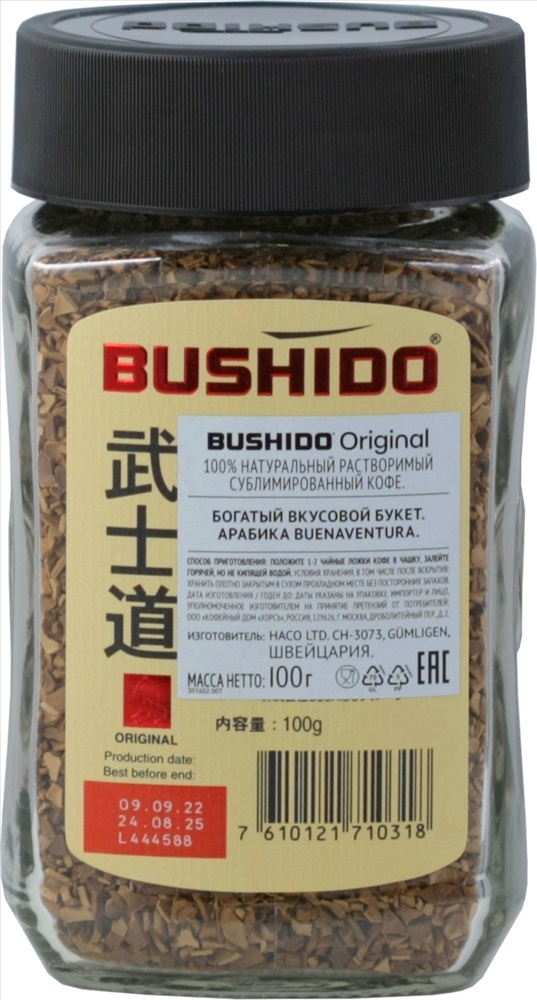 Наличие: >100 Натуральный растворимый кофе. Состав: Арабика Buenaventura.Original произведен из зерен южноамериканской арабики, бережная медленная обжарка придает кофе изысканный, тонкий и нежный аромат. Вкус сбалансированный и гармоничный.BUSHIDO — создан для наслаждения! Комментарии к товару