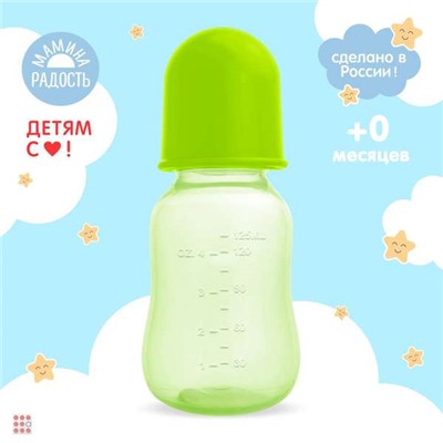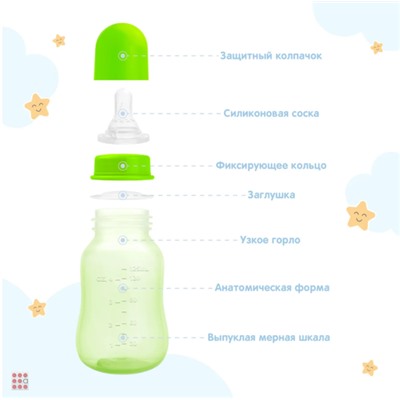 Бутылочка для кормления с соской, талия 125 мл, в ассорти Бутылочка с узким горлом (диаметр - 25 мм) предназначена для кормления малыша с рождения. Анатомическая форма бутылочки разработана для удобного захвата. Бутылочка имеет герметичную крышку, заглушку и комплектуется силиконовой соской с медленным потоком, размер S (диаметр отверстия - 0,6 мм). Оснащена выпуклой шкалой с удобным шагом - 30 мл. Нестираемая шкала на стенке бутылочки позволяет приготовить нужное количество питания. Бутылочку можно стерилизовать в кипящей воде или паровом стерилизаторе. Бутылочки с узким горлышком оснащены заглушкой, которая позволяет использовать бутылочку в качестве контейнера для хранения молока. Соски для бутылочек изготовлены из гипоаллергенного материала - пищевого силикона, который не окисляется и не выделяет вредных веществ. Силиконовые соски безопасны для нежных десен малыша и устойчивы к укусам. Оснащены антивакуумным клапаном. К бутылочке подходят соски ТМ BOOL-BOOL серии BABY FLOW размером S, M, L, X для узкого горла. Продукция изготовлена из прочного, безопасного полипропилена (РР5) и силикона, качество которого соответствует техническому регламенту Таможенного союза - ТР ТС 007/2011. Материал бутылочки абсолютно безопасен для здоровья, не выделяет токсичных веществ при нагревании, не придает пищевым продуктам посторонний вкус или аромат, не содержит Бисфенол А. Силикон не деформируется от влаги, не способствует росту грибков, образованию плесени и развитию бактерий. Сделано в России. Объем 125 мл. Комментарии к товару