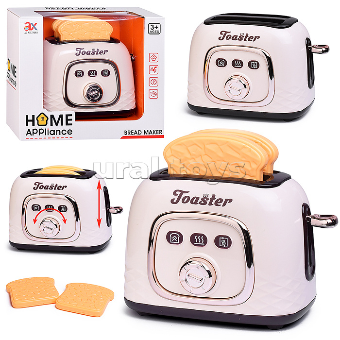Код: 492682 Штрихкод: 6904111732208 Страна производитель: Китай Размеры упаковки: 20 x 17 x 9 см Количество в коробке: 60 • В наборе: - тостер (14х7.5х10 см.) - 2 пластиковых хлебца (7,5х1х7 см.) • Для приготовления нужно опустить вниз рычаг. • По истечении времени тосты подпрыгнут вверх. • Материал: пластик. • Соответствует требованиям безопасности продукции. • Для детей от 3-х лет. Комментарии к товару