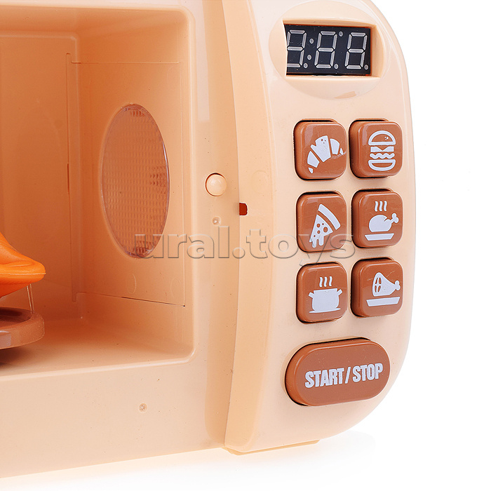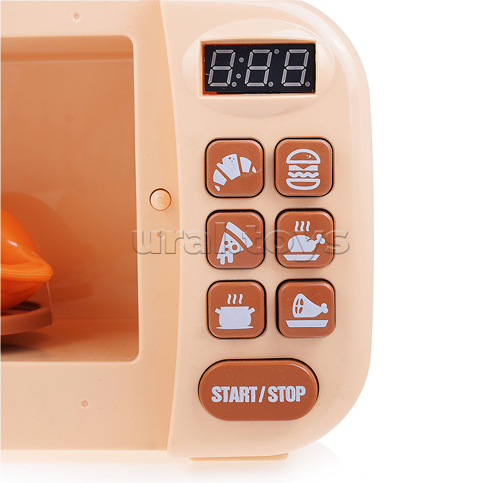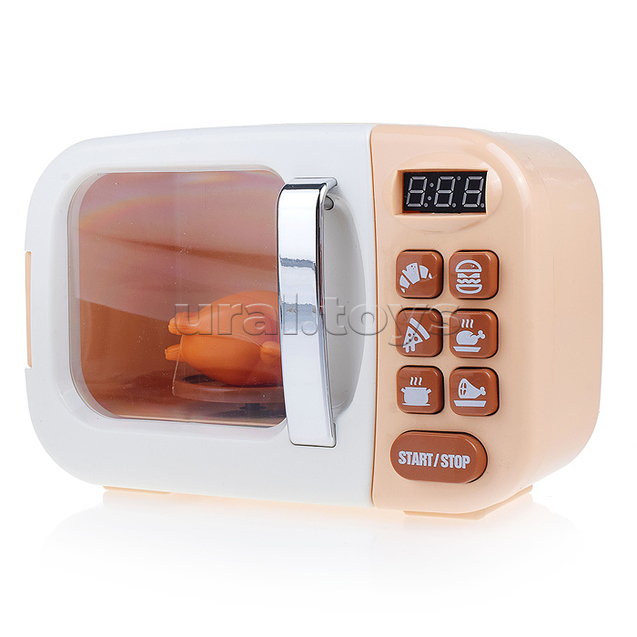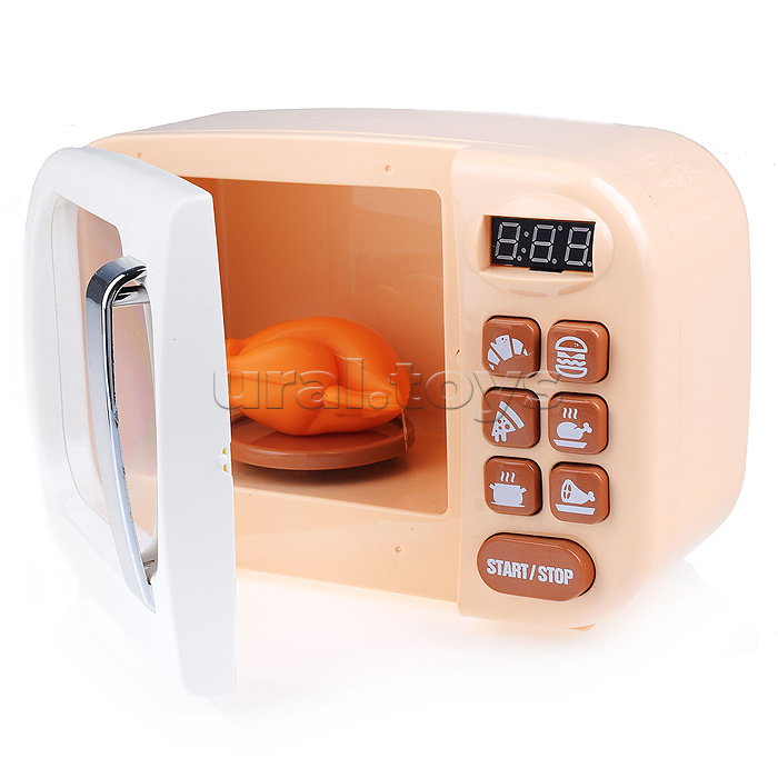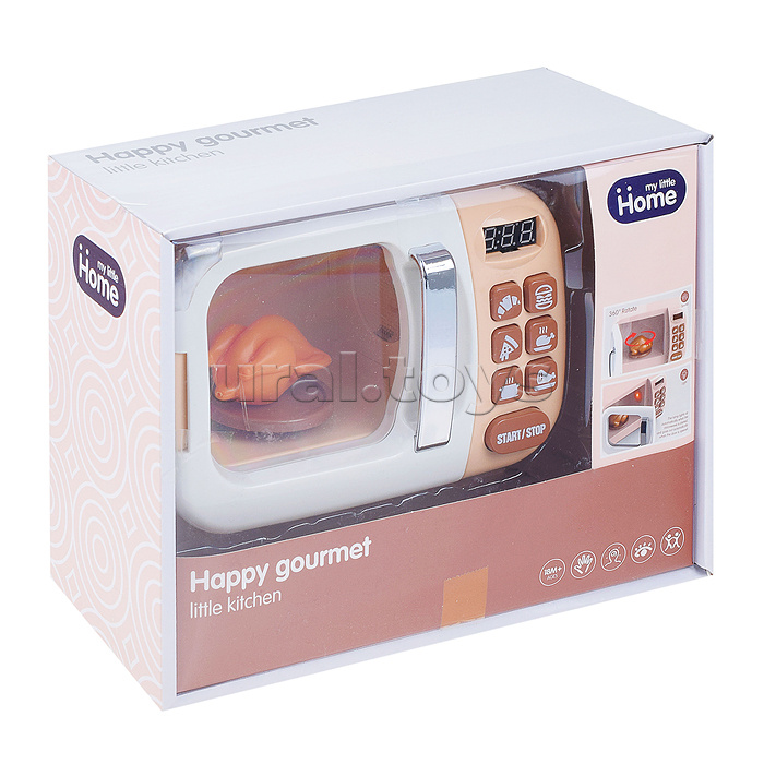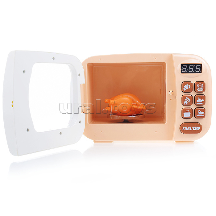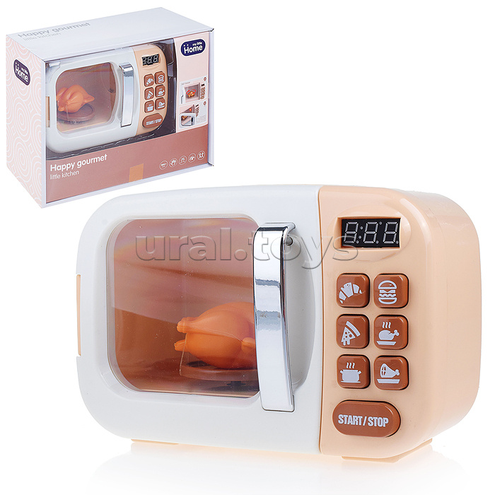Код: 344841 Штрихкод: 6933111990844 Страна производитель: Китай Размеры упаковки: 28 x 22 x 12 см Количество в коробке: 36 • В наборе: - микроволновка (21х9.5х13.5 см.) - фигурка курицы (6х3х3.5 см.) • Открывающаяся двердца. • Чтобы начать готовить нужно выбрать 1 из 6 режимов, на каждом режиме устанавливается разное время. • После запуска таймер отсчитывает время, внутри вращается блюдо и горит красная лампочка. • По истечении времени подаётся звуковой сигнал. • Для работы нужны 2 батарейки "АА" (не входят в комплект). • Материал: пластик. • Соответствует требованиям безопасности продукции. • Для детей от 1.5 лет. Комментарии к товару