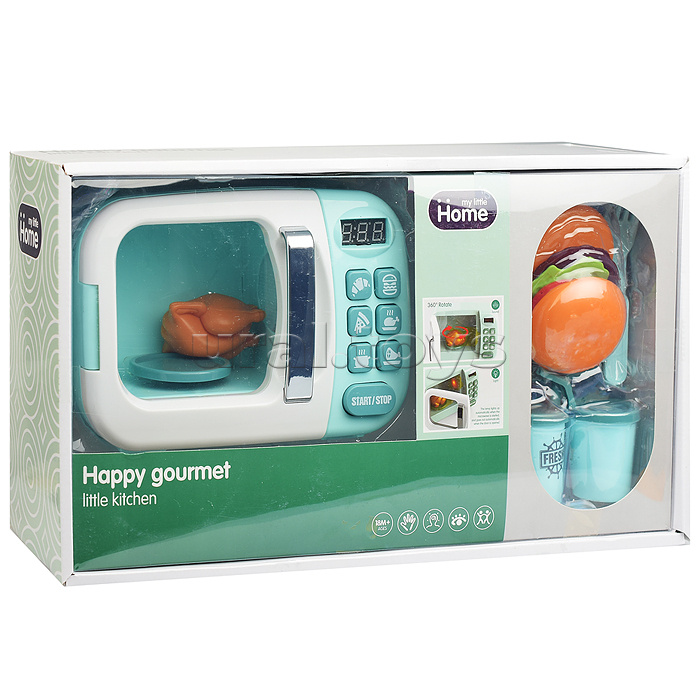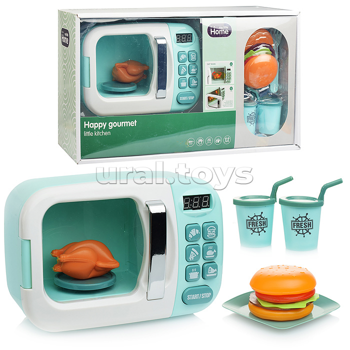 • Размеры игрушки: 20х10х13.5 см. • Работает от 2-х батареек "АА" (не входят в комплект). • Функции: - открывается дверца. - установка таймера (1; 1.5; 2; 3 мин.). - вращение блюда. - красная подсветка. • В комплекте: гамбургер, 2 стаканчика, тарелка, вилка, нож. • Материал: пластик. • Соответствует требованиям безопасности продукции. • Для детей от 1.5 лет.