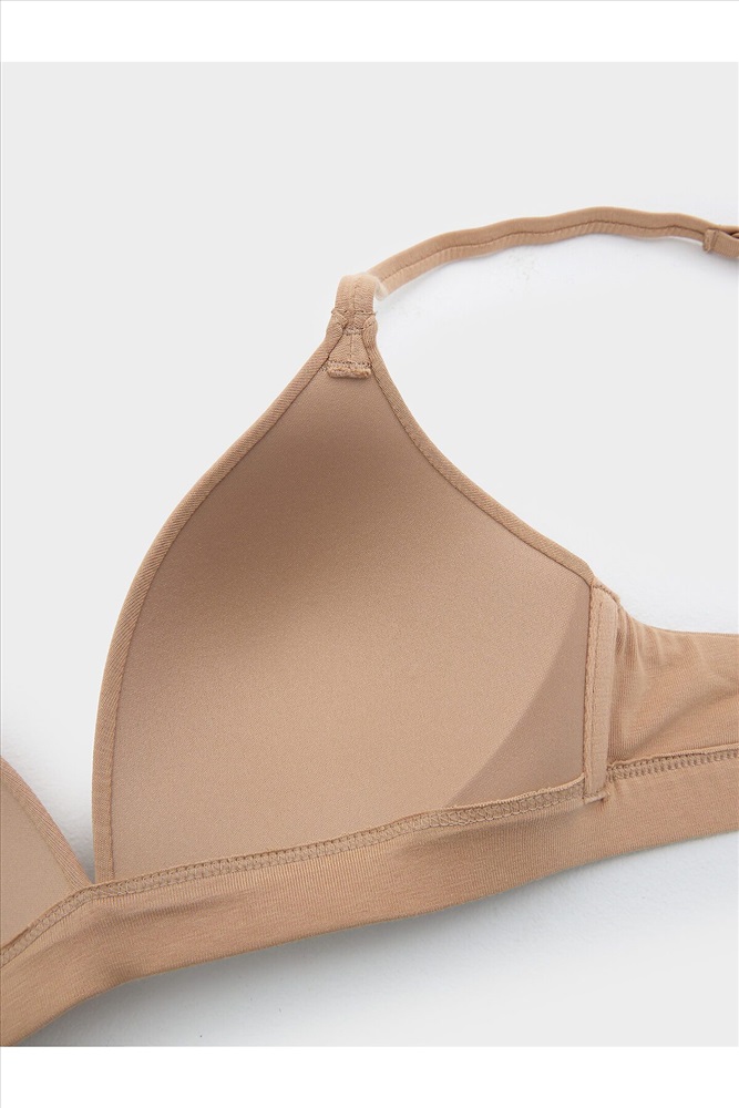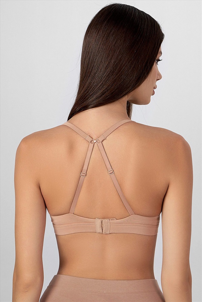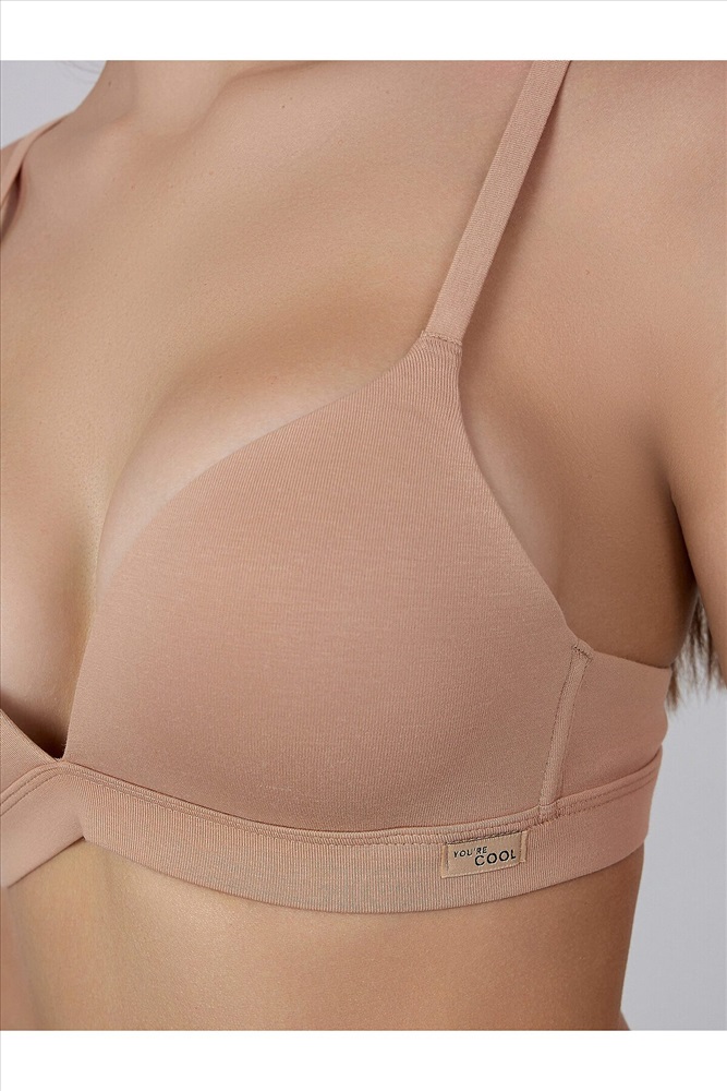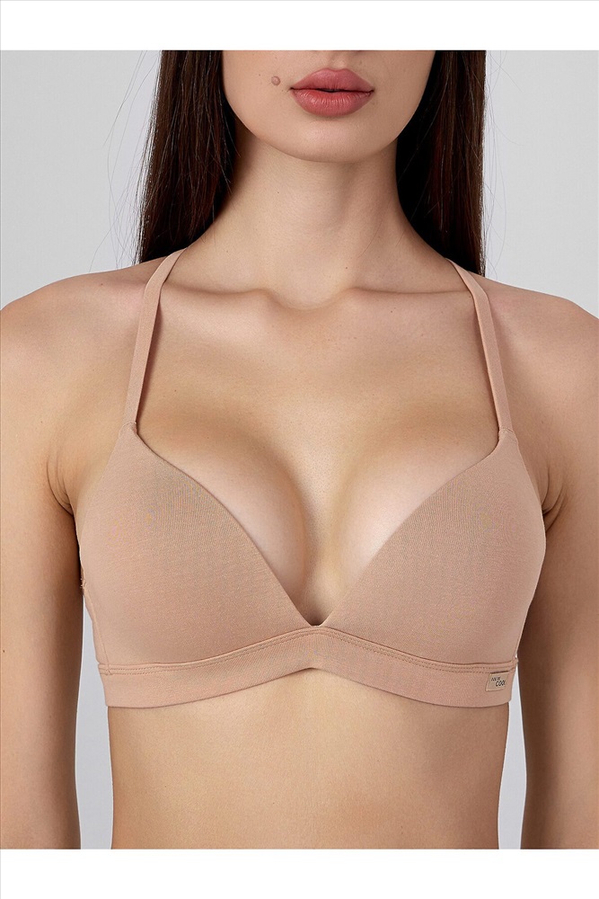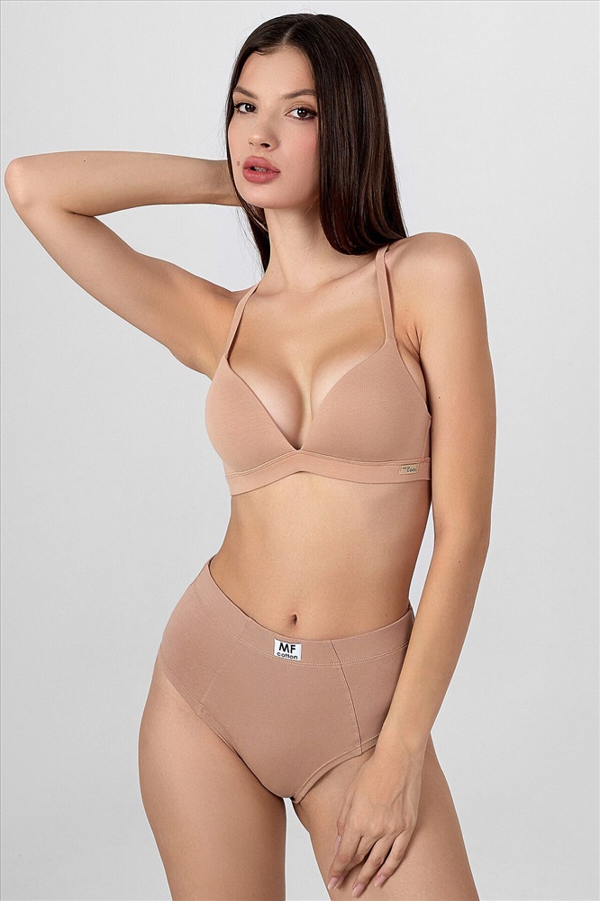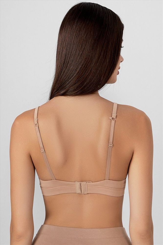 Бюстгальтер женский изготовлен из трикотажного кулирного полотна, с твердыми формоваными чашками, без каркасов. Чашка (HN-57) обтянута трикотажным полотном с подформовкой. Бочки отрезные. В бочках пластины. Верхний срез бочка обтачан подкладкой из основного полотна с эластичной тесьмой 10 мм (жесткая б/зуба WTE-10, девсел 487W) внутри. Нижний срез окантован бейкой из основного полотна с эластичной тесьмой 25 мм внутри (внутренняя тесьма). Бретели по размерам 10 мм и 15 мм по размерам регулируются по длине сзади. Бретель с надставкой из основного полотна с эл тесьмой (жесткая б/зуба WTE-10 , WTE1-15, девсел 487W) внутри. Надставка соединяется с бретельной тесьмой 10 мм и 15 мм по размерам (SWE2, девсел 1879W) через кольцо на одной бретели и через застежку-кольцо на другой бретели. Регуляторы, кольцо и застежка-кольцо металлические 10 и 15 мм по размерам. Застежка крючки-петли двойная двухрядная 38 мм. Декор по Заданию! на окантовке с левой стороны настрочена тканая этикетка